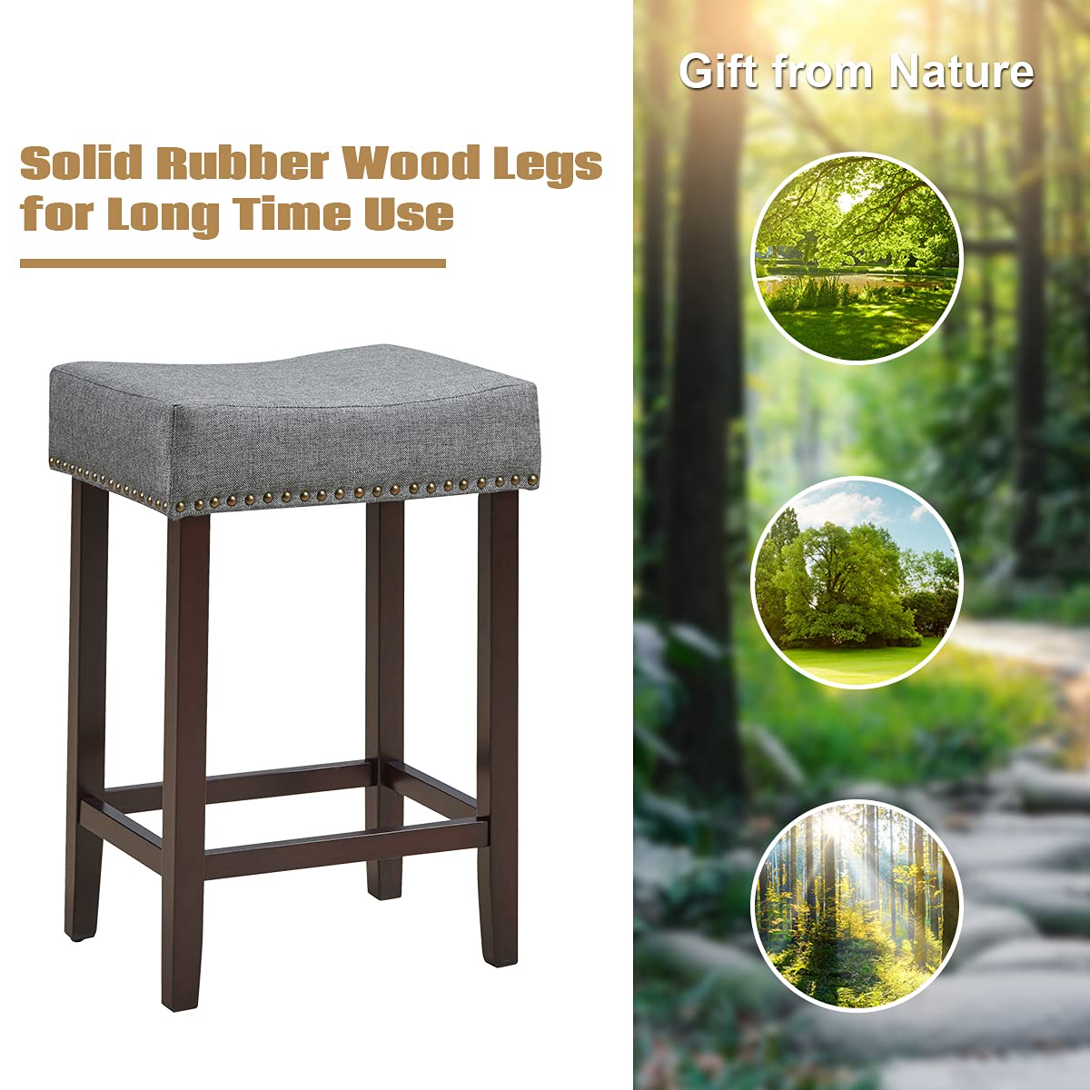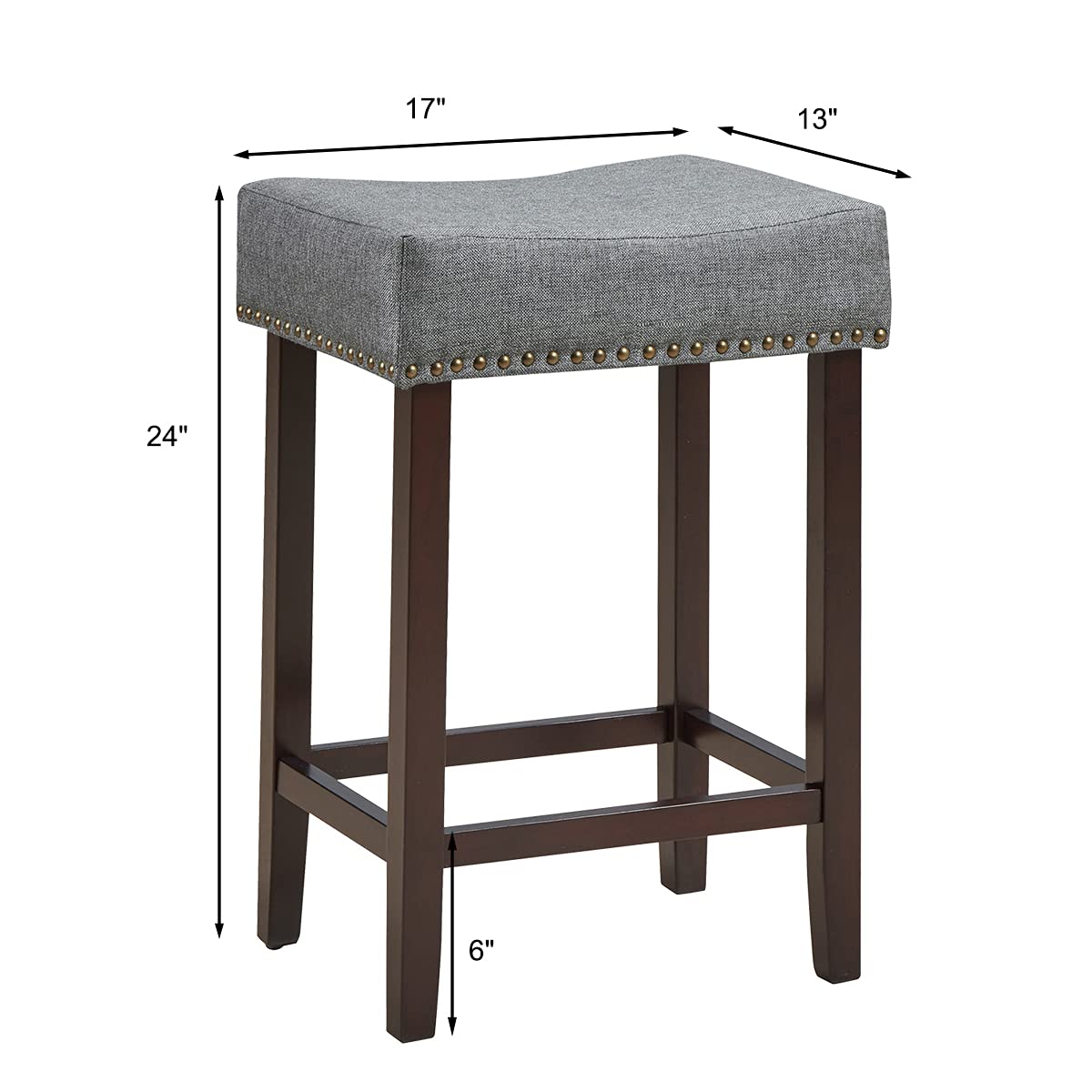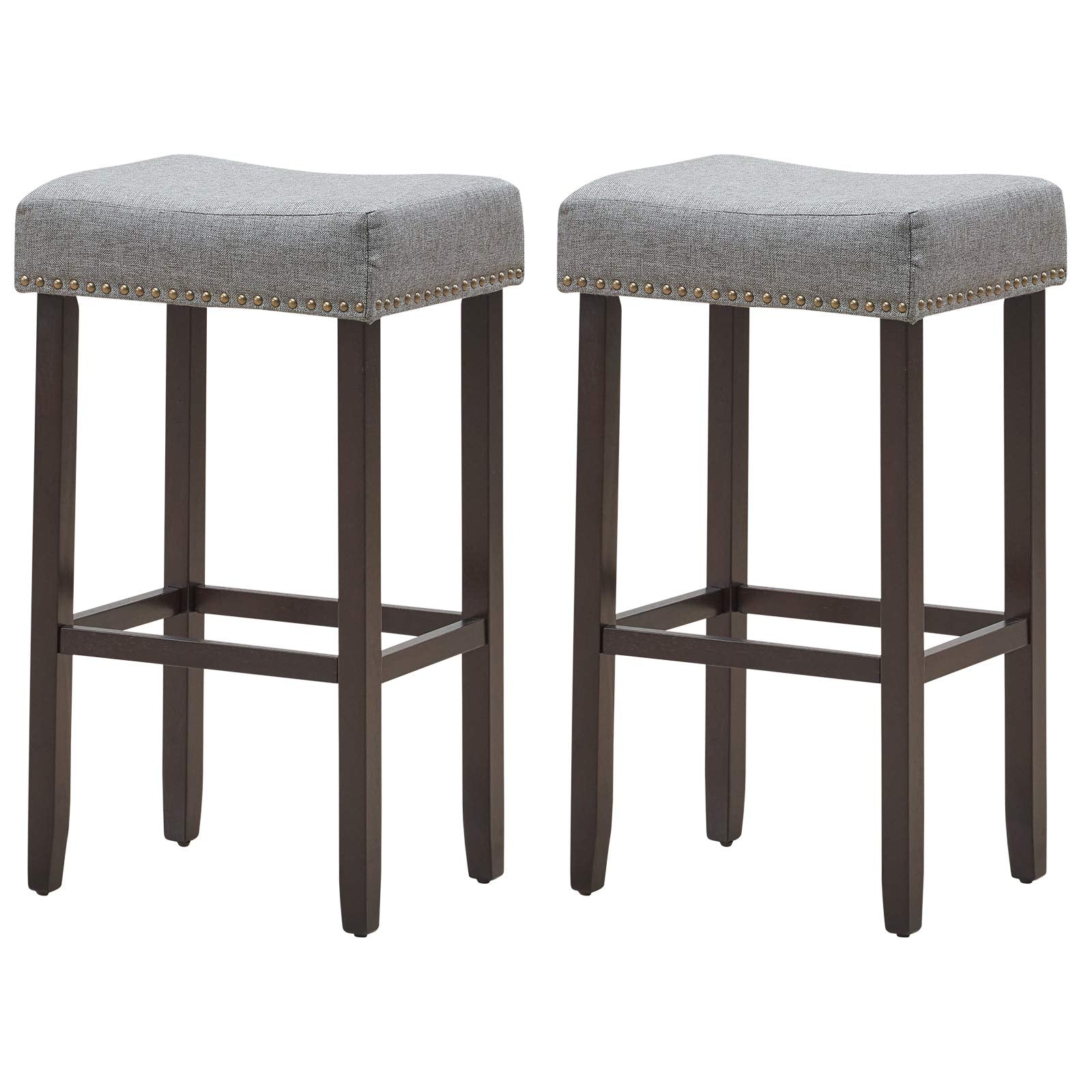 Made of solid rubber wood construction, these stools provide you with years of durable use. The seats are firmly cushioned and equipped with mixed linen and cotton fabric upholstery. Ergonomically saddle shape pluses feet pedals for much comfort. Classic nailhead studs are set around the stools, revealing the royal atmosphere. What’s more, these upholstered stools are pretty easy to assemble with our easy-to-follow instructions. With a simple and elegant design, these stools are compatible with your home, bars, office, etc.