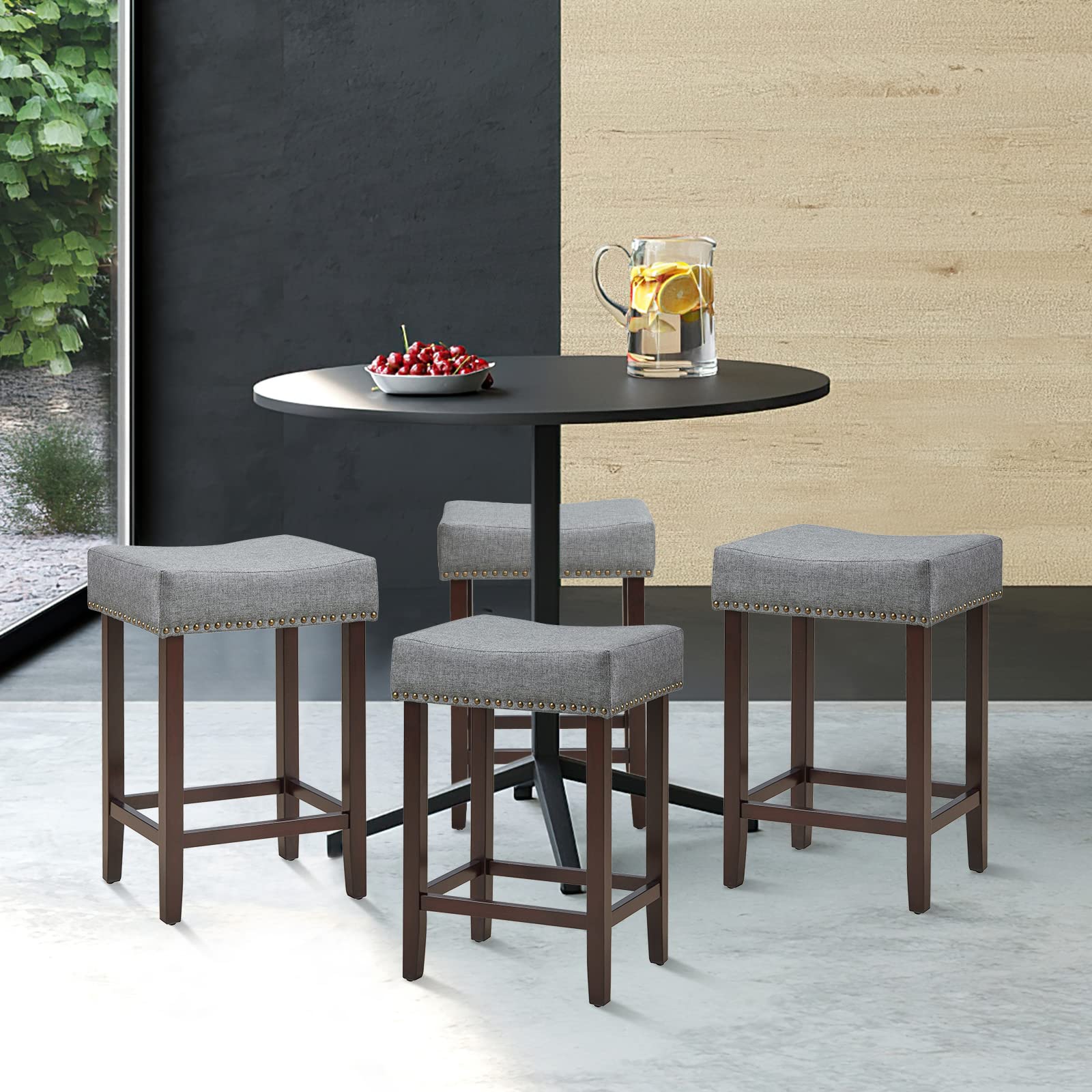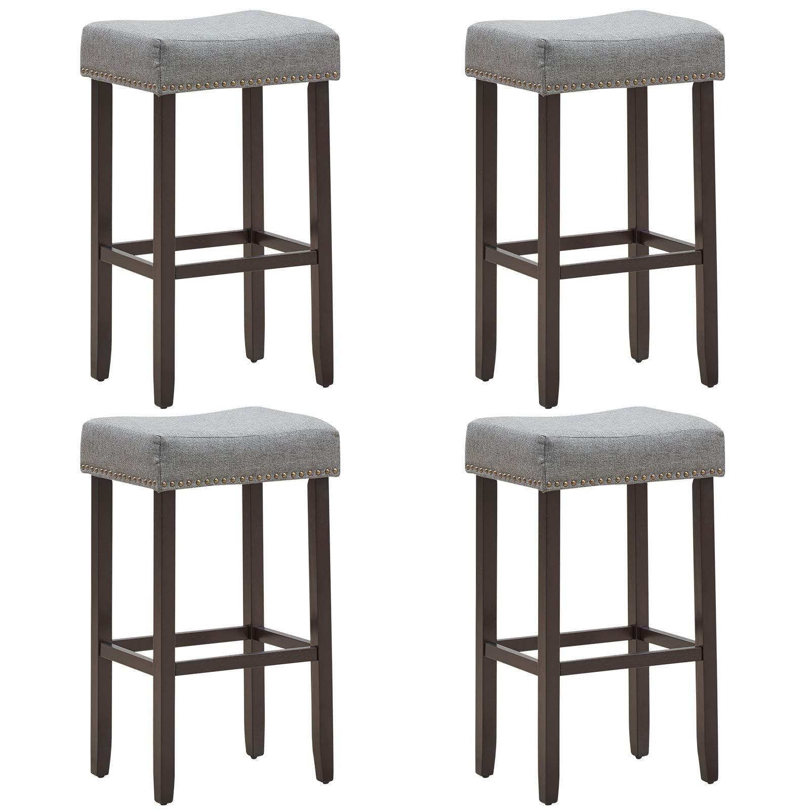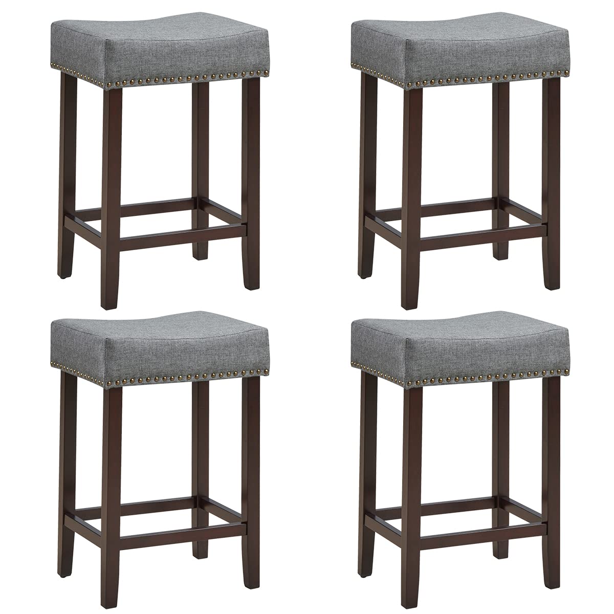 Made of solid rubber wood construction, these stools provide you with years of durable use. The seats are firmly cushioned and equipped with mixed linen and cotton fabric upholstery. Ergonomically saddle shape pluses feet pedals for much comfort. Classic nailhead studs are set around the stools, revealing the royal atmosphere. What’s more, these upholstered stools are pretty easy to assemble with our easy-to-follow instructions. With a simple and elegant design, these stools are compatible with your home, bars, office, etc.