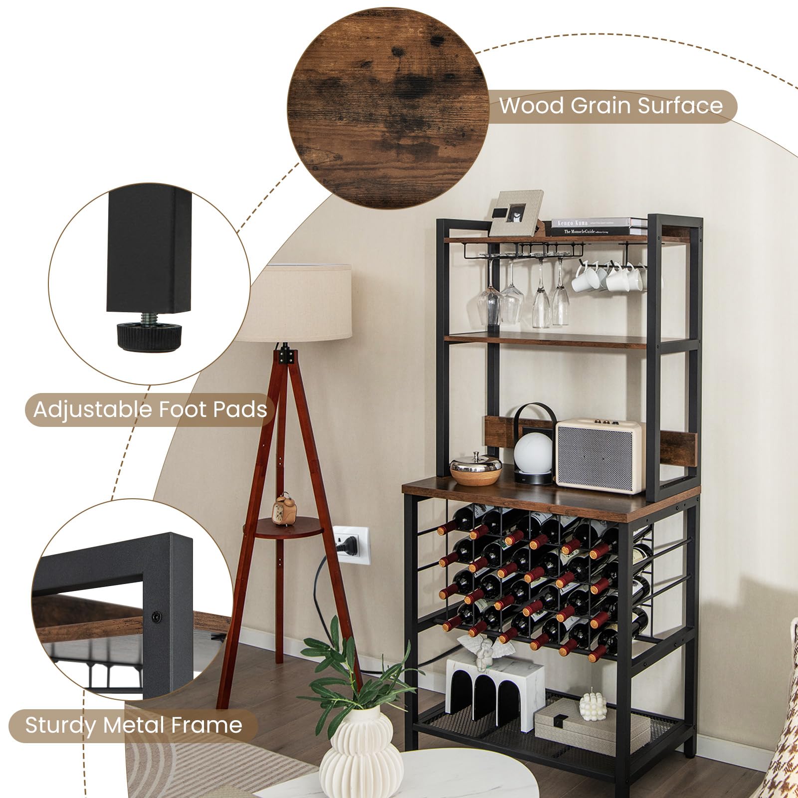 Are you looking for a wine rack with large storage space? Look no further than our wine rack. Offering diversified storage space, this rack is designed to meet your needs for different items. With the capacity to hold up to 9 wine glasses and 24 wine bottles, you can easily organize your favorite vintages. Plus, the wide countertop provides ample space for placing a microwave, kitchenware, dinnerware, and seasonings, making it a versatile solution for all your storage needs.