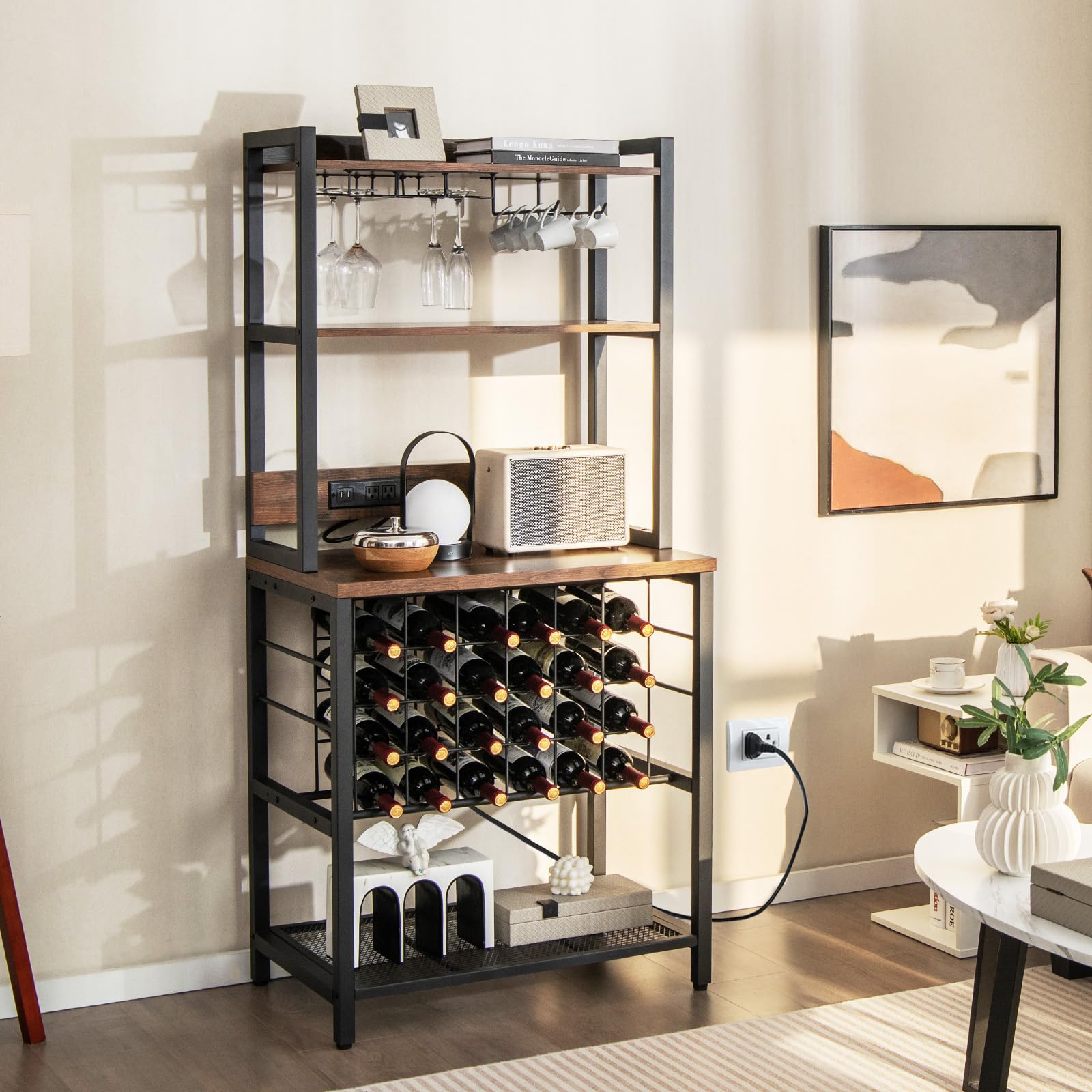 - [Ample Storage Storage]: This wine rack offers diversified storage space to meet your storage needs for different items, it can hold up 9 wine glasses and 24 wine bottles. Besides, the wide countertop offers enough space to place microwave, kitchenware, dinnerware and seasonings.