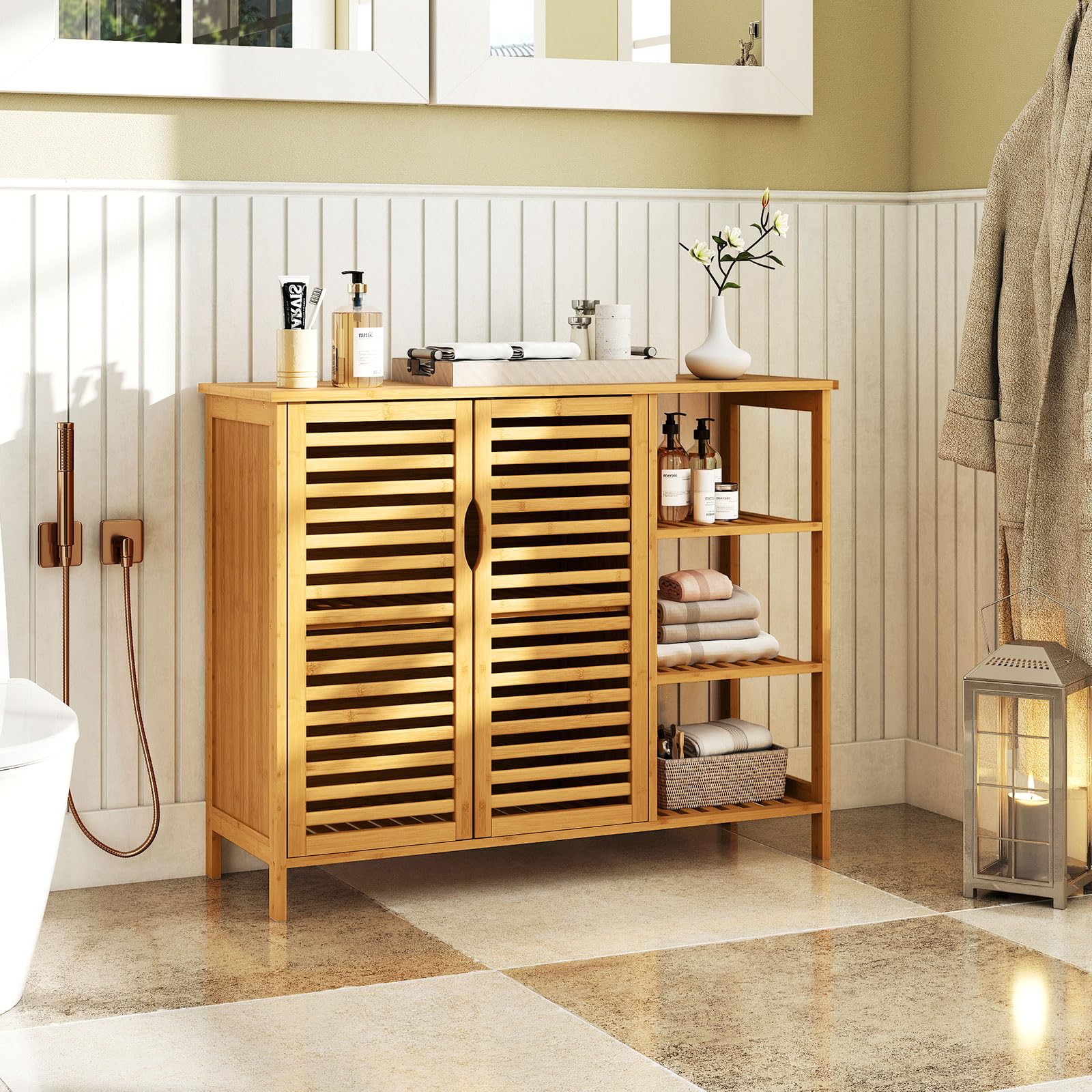 Add rustic charm to your space with the versatile bathroom cabinet crafted from premium bamboo. This sturdy cabinet offers ample storage space with an enclosed cabinet, open shelves, and a top surface for organizing essentials like toilet paper and towels. Safety features such as an anti-tipping kit and protective foot pads ensure a secure addition to your home. The 2-door design with sleek handles and magnetic catches allows easy access to stored items. Waterproof and low maintenance, this cabinet is ideal for bathrooms, kitchens, living rooms, or dining areas, bringing both functionality and style to different rooms.