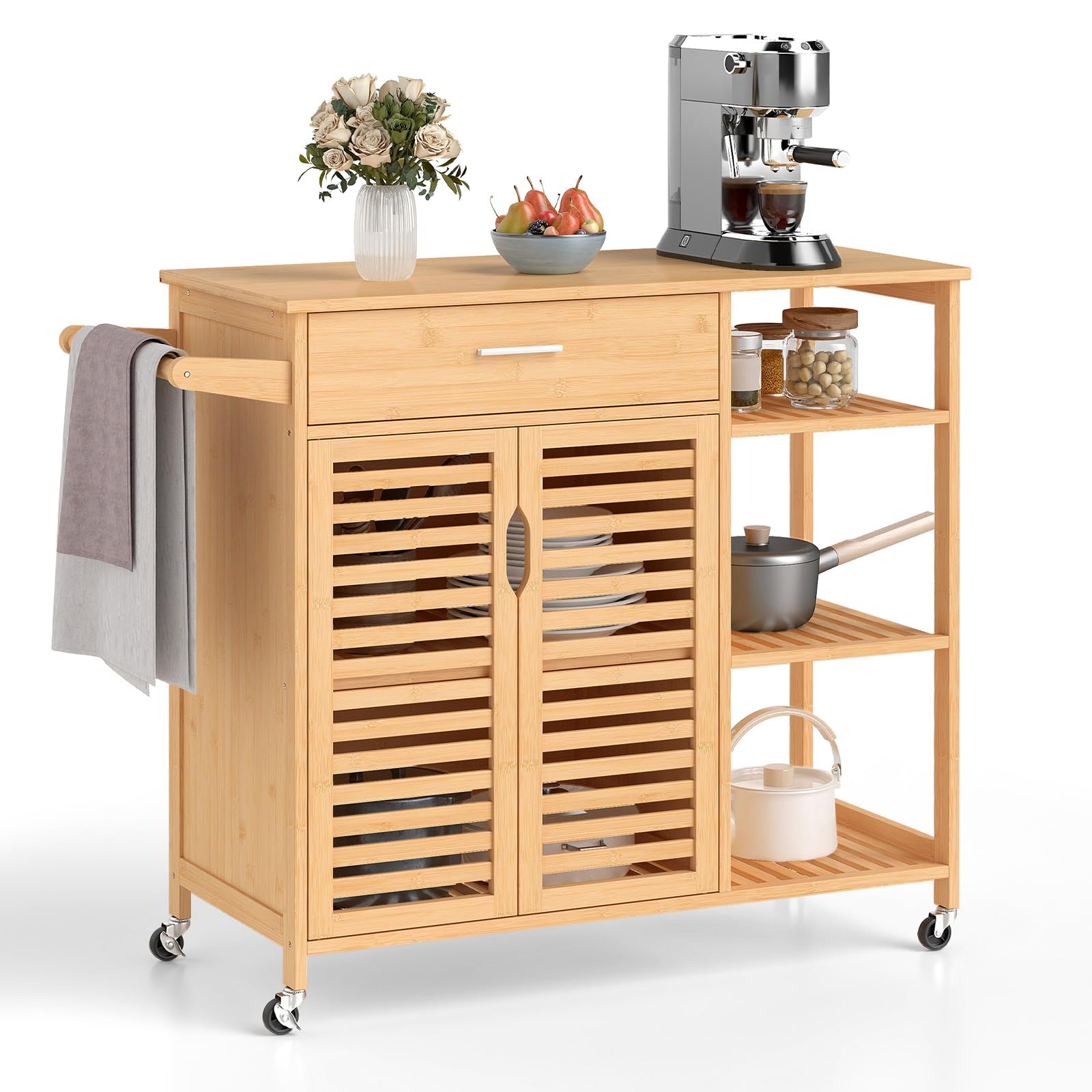 It is a hub of convenience with the spacious top surface, large drawer, enclosed cabinet and 3-tier open shelf, perfect for storing your essential kitchenware. Designed to offer robust support and durability, the serving cart is crafted from high-quality bamboo, ensuring a sturdy and lasting addition to your kitchen arsenal. Navigating through the kitchen becomes a breeze with its 4 smooth-rolling universal wheels. Besides, you can simply lock 2 of the wheels for a secure and stable setup. Not limited to just one use, the versatile piece effortlessly transitions into a utility trolley, chic coffee bar, or a handy microwave stand, making it an ideal choice for different rooms. Enjoy a blend of style, utility, and mobility that brings both flair and function to your living space.