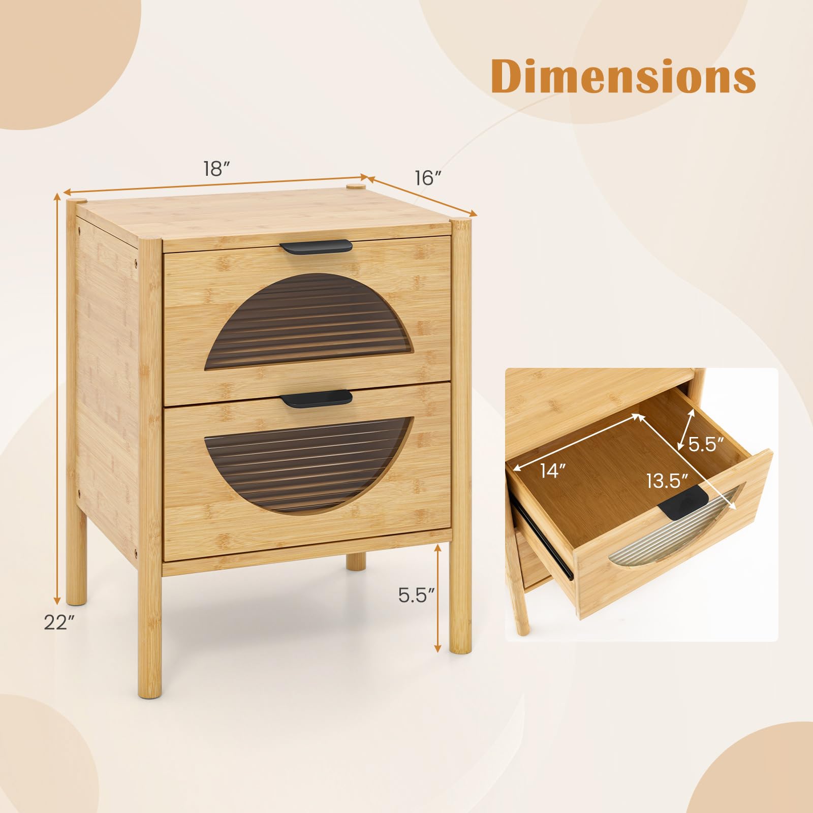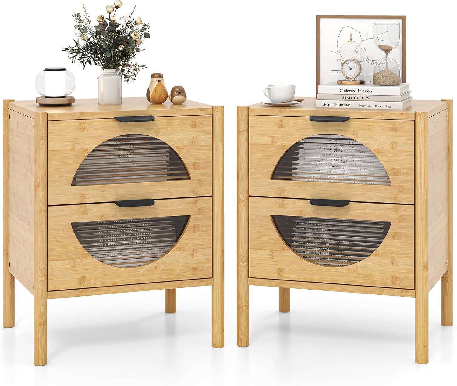 Discover the perfect blend of style and functionality with this stunning bamboo nightstand! Elevate your bedroom with its rustic charm and sleek modern touches, featuring natural bamboo, chic reeded glass, and an elegant metal handle. Say goodbye to clutter with 2 spacious drawers and a spacious tabletop, perfect for keeping all your essentials organized and close at hand. Crafted from sustainable, high-strength bamboo, this piece isn’t just beautiful—it’s built to last. Plus, its raised legs include protective pads to keep your floors pristine. Versatile and stylish, it effortlessly transitions from a chic bedside table to a trendy end table or a savvy office storage solution. Upgrade your space with this exquisite, multi-functional showpiece today!