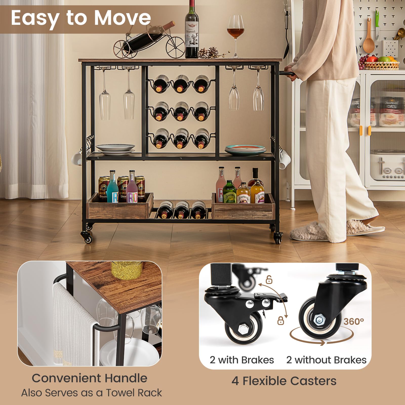 This 3-tier liquor cart is able to hold multiple glasses and bottles, ensuring your favorite wines are always within reach. With additional storage areas such as a spacious tabletop, 2 open compartments, 8 side hooks, and 2 bottom boxes, you have plenty of options to organize your essentials. It is easy to move this home serving cart with 4 universal casters, 2 of which can be locked for stability. Moreover, the versatile push handle also functions as a convenient towel rack. Supported by a heavy-duty metal frame, the beverage cart is sturdy. Furthermore, the rustic and elegant outlook adds a timeless charm to your home, whether in the kitchen, dining room, living room or more.