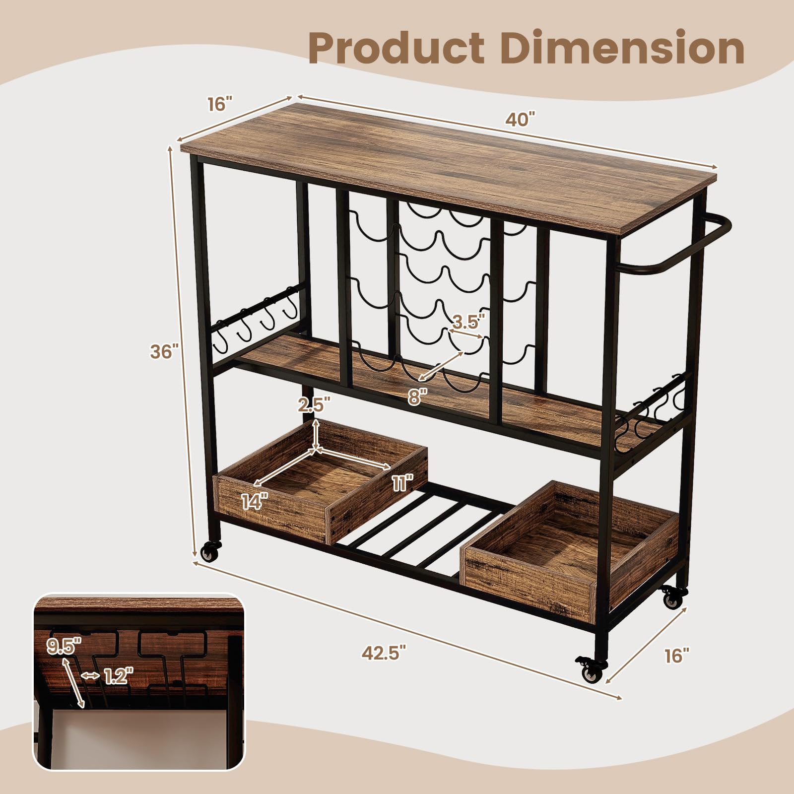 - Classified Storage Solution: Designed with glass racks and bottle holders, this rolling bar cart makes your favorite vintages always at hand. Moreover, the additional storage areas �C a spacious tabletop, 2 open compartments, 8 side hooks and 2 bottom boxes �C provide more storage options.