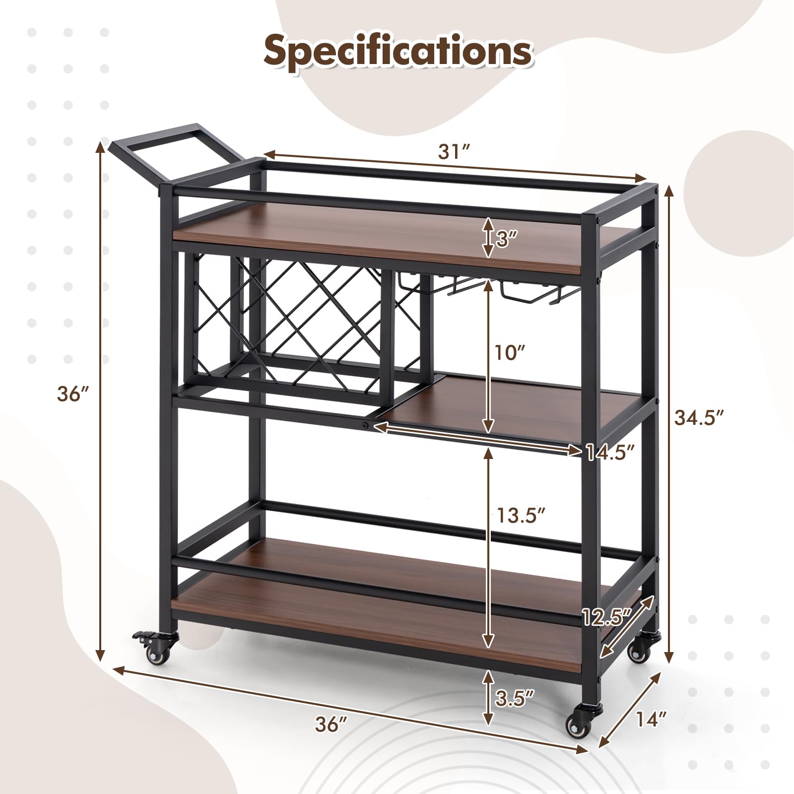Versatile usage as a bar cart, kitchen cart, or beverage cart