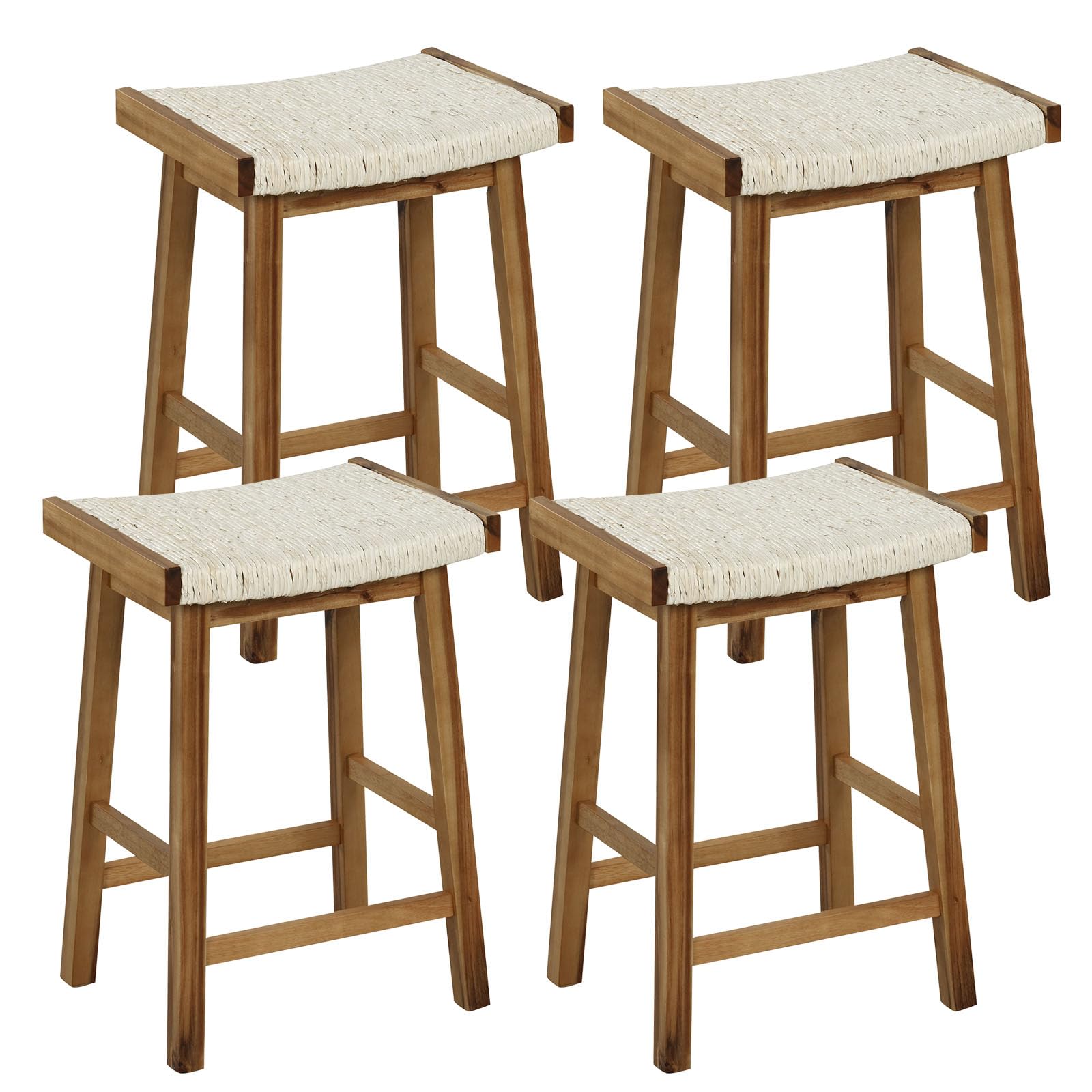 Bring style and sophistication to your space with this saddle stool set. Each backless barstool features a seaweed woven seat that provides unique aesthetics and optimal comfort. The unique seaweed woven design ensures easy integration with any decor style. Its height is perfect for most common kitchen counters or islands, and the convenient footrests allow you to relax your feet, providing a comfy seating experience. Constructed with durable materials, including a sturdy wooden frame, these stools offer stability and support for everyday use. The versatile design makes these stools applicable to various occasions, such as kitchen counters, home bars, or coffee shops.