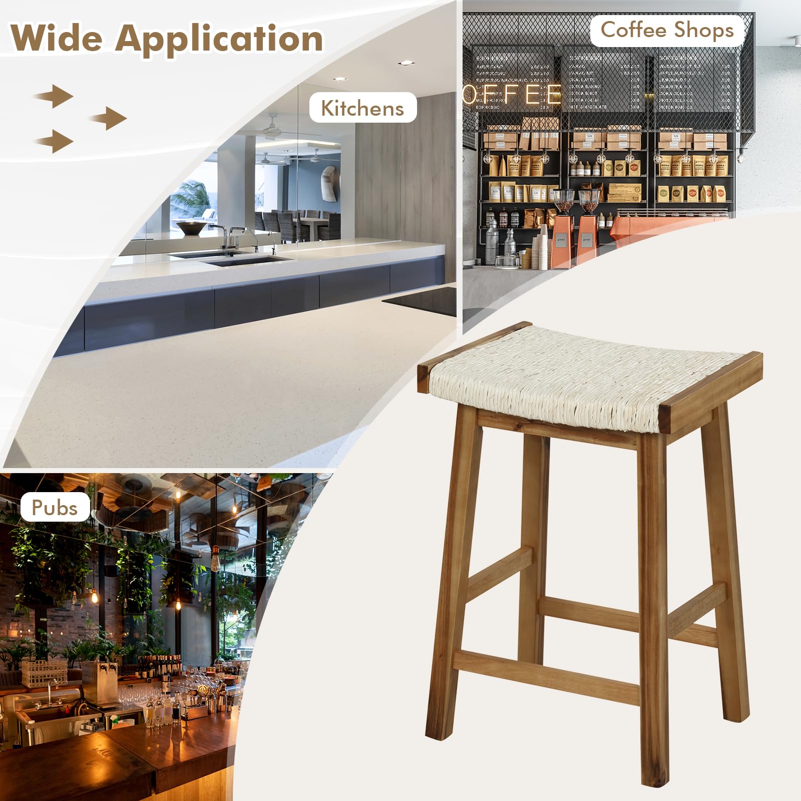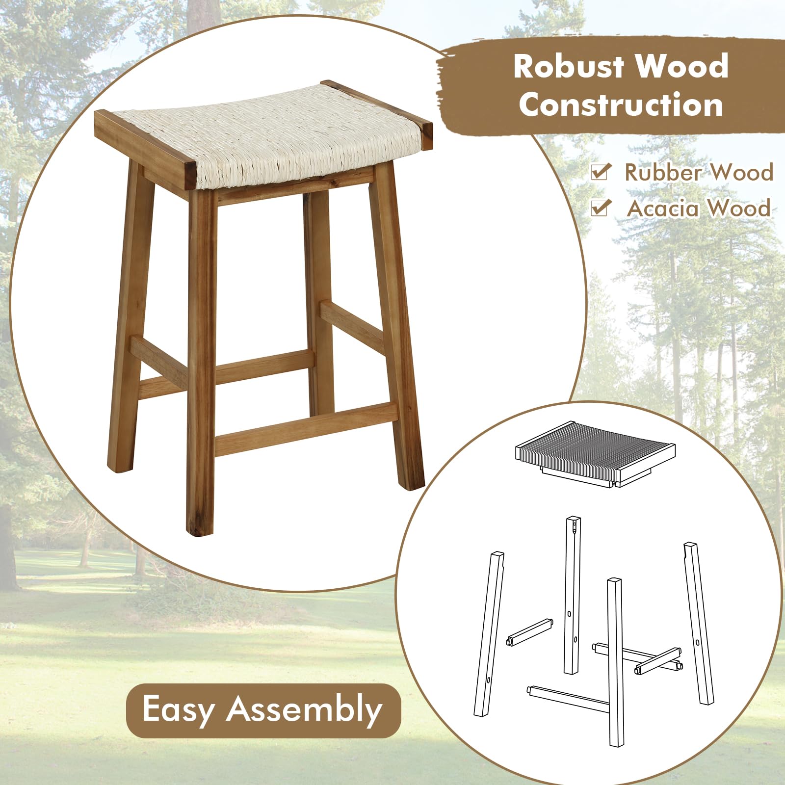 - Stable & Reliable Construction: Our bar stools are mainly made from acacia wood and rubber wood, which are known for their sturdy nature and resistance to warping. Additionally, the bottom non-slip foot pads enhance its stability while protecting floors from scratches.