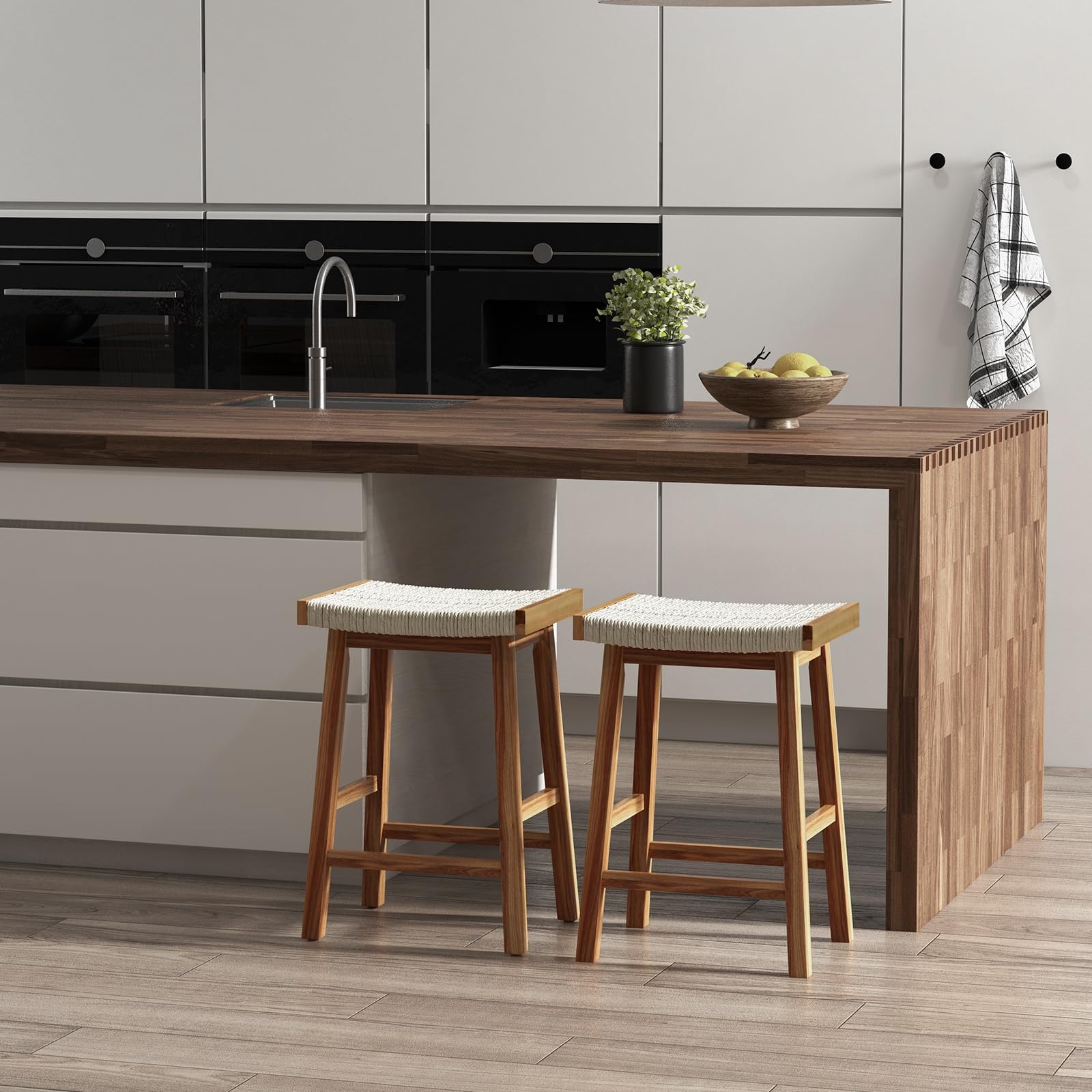 - Chic & Backless Design: This barstool set has a stylish look with a unique interwoven seaweed design, enhancing contemporary aesthetics. Additionally, its backless design allows you to easily tuck the stools under the table for storage without taking up too much space.