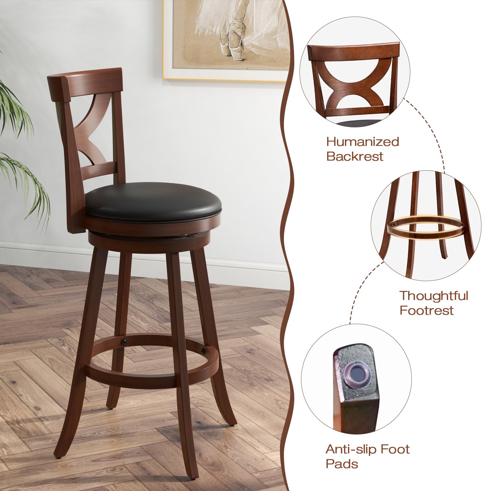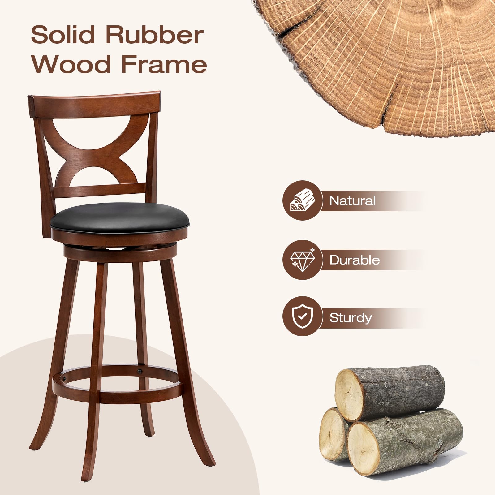 - [Solid Rubber Wood Frame]: The swivel bar stools are framed by natural rubber wood that is durable and sturdy. Additionally, the flared legs and round footrest enhance overall stability. The anti-slip foot pads prevent the floor from scratches.