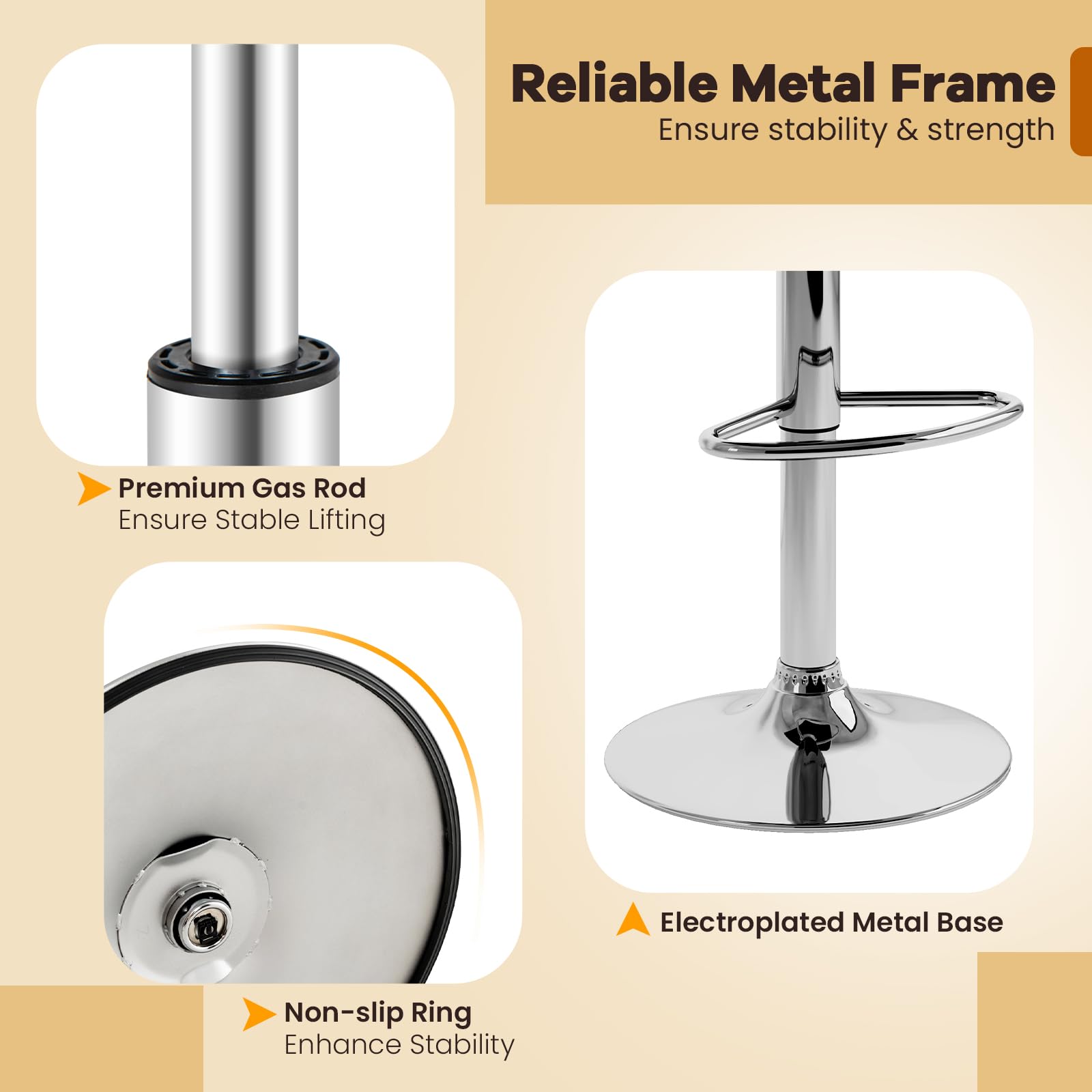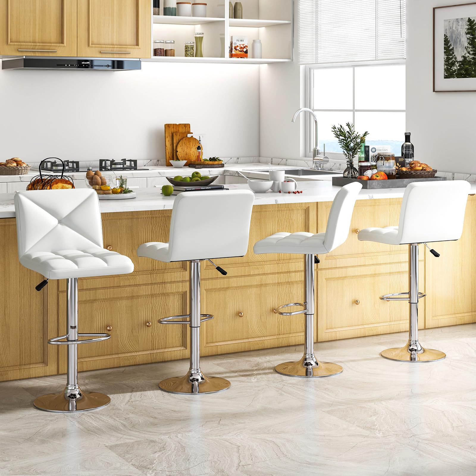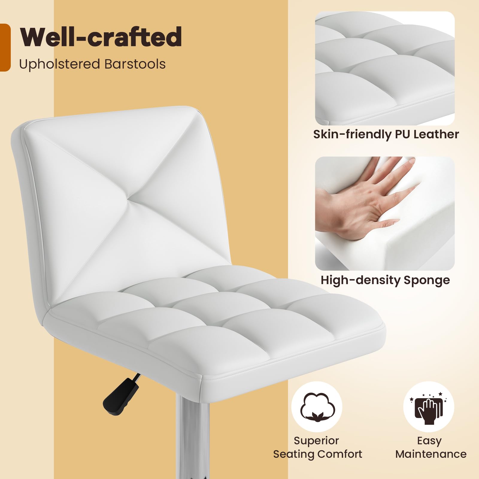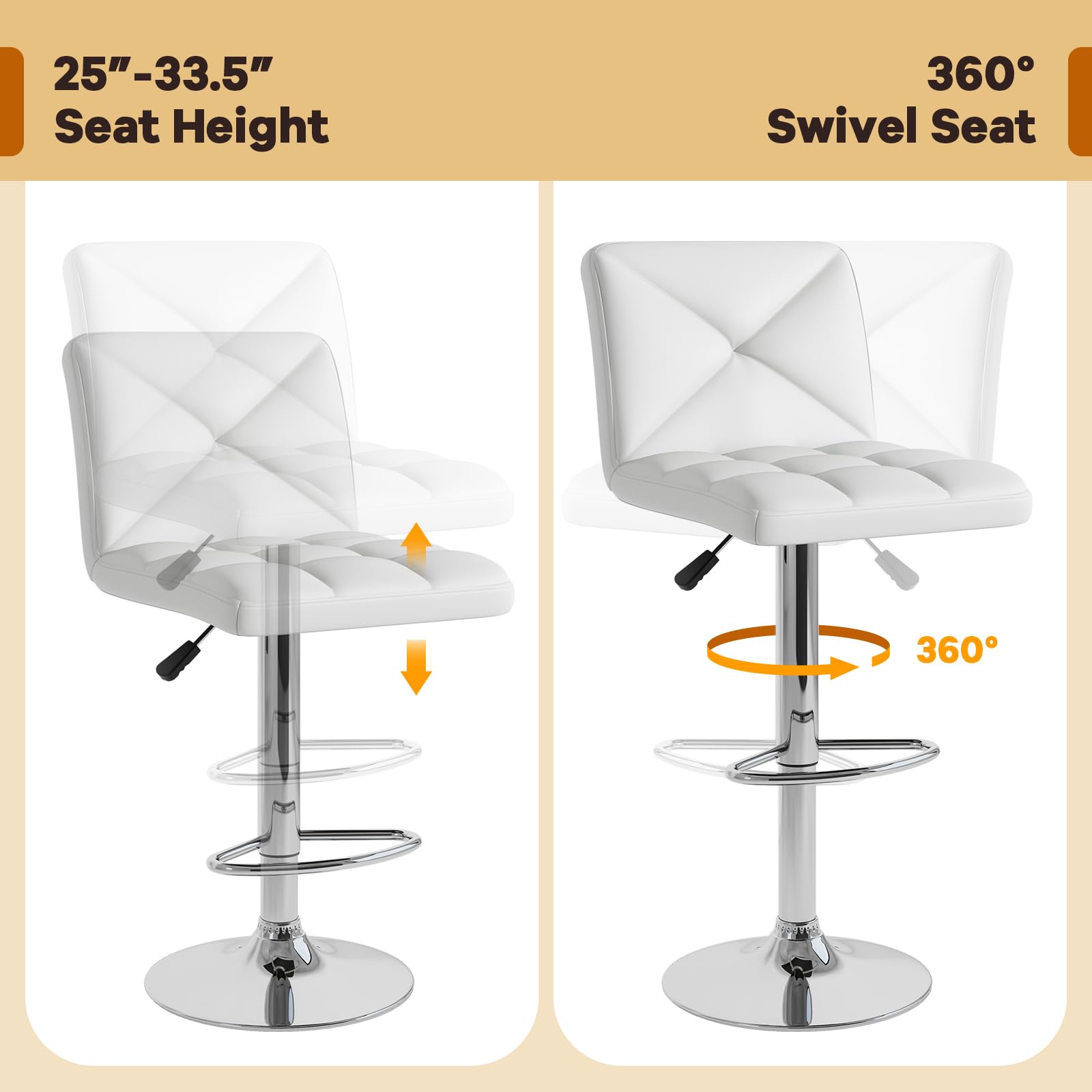 Ready to elevate your home bar or kitchen island with a touch of elegance? Our well-crafted upholstered barstools feature 360° swivel and adjustable heights for the ultimate in dynamic seating. Wrapped in sleek PU leather, they ensure not only a chic appeal but also unmatched durability. Immerse in comfort with plush backrests and footrests that make long conversations a breeze. With a sturdy, slip-resistant metal base, these island stools offer both safety and sophistication. Don’t miss out—make these versatile stools yours and be the envy of every guest!