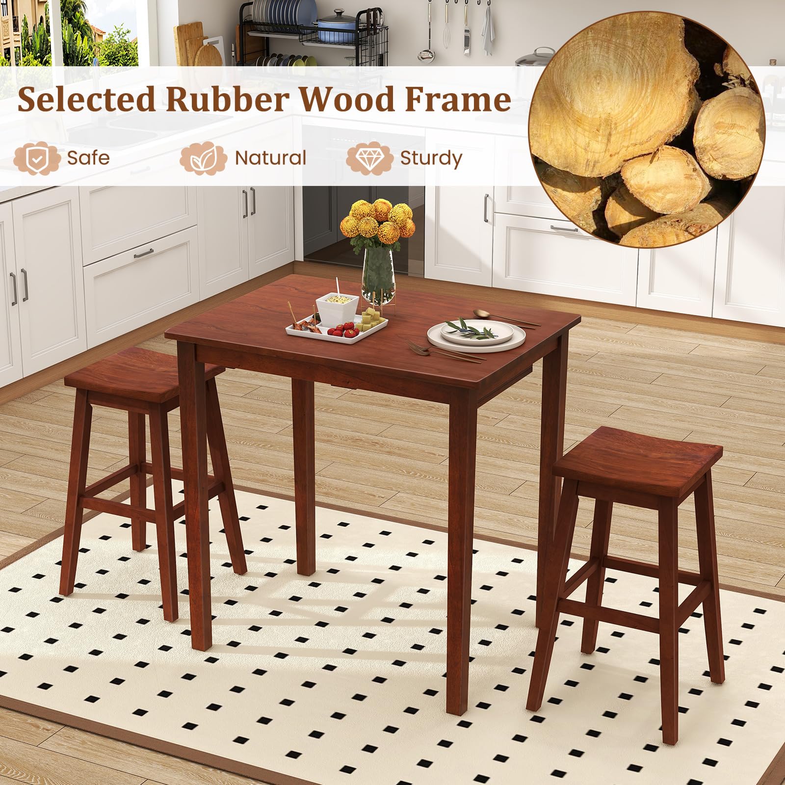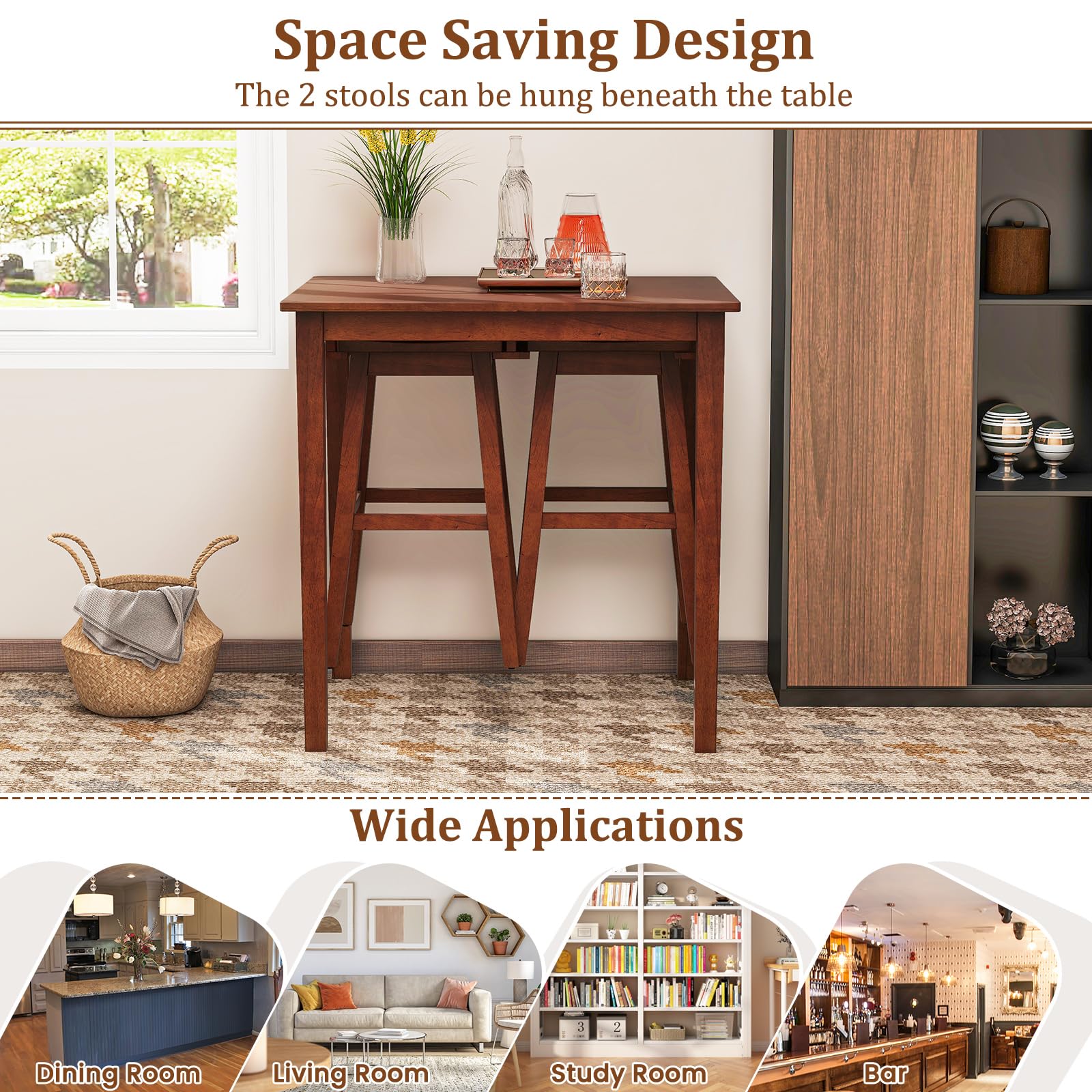 Enhance your living space with this stylish 3-piece bar table set, perfect for small rooms. The dining set includes a square table and 2 bar stools that can be conveniently hung beneath the table when not in use, saving valuable space. The 35.5" x 26" wide MDF tabletop with wood veneer is durable and spacious enough for all your dining needs. With a natural aesthetic, this breakfast nook table set seamlessly fits into dining rooms, living rooms, studies, and bars. The wide curved seats and footrests on each stool provide maximum comfort. Easy maintenance and ideal dimensions ensure a reliable and smooth surface that complements your space perfectly.