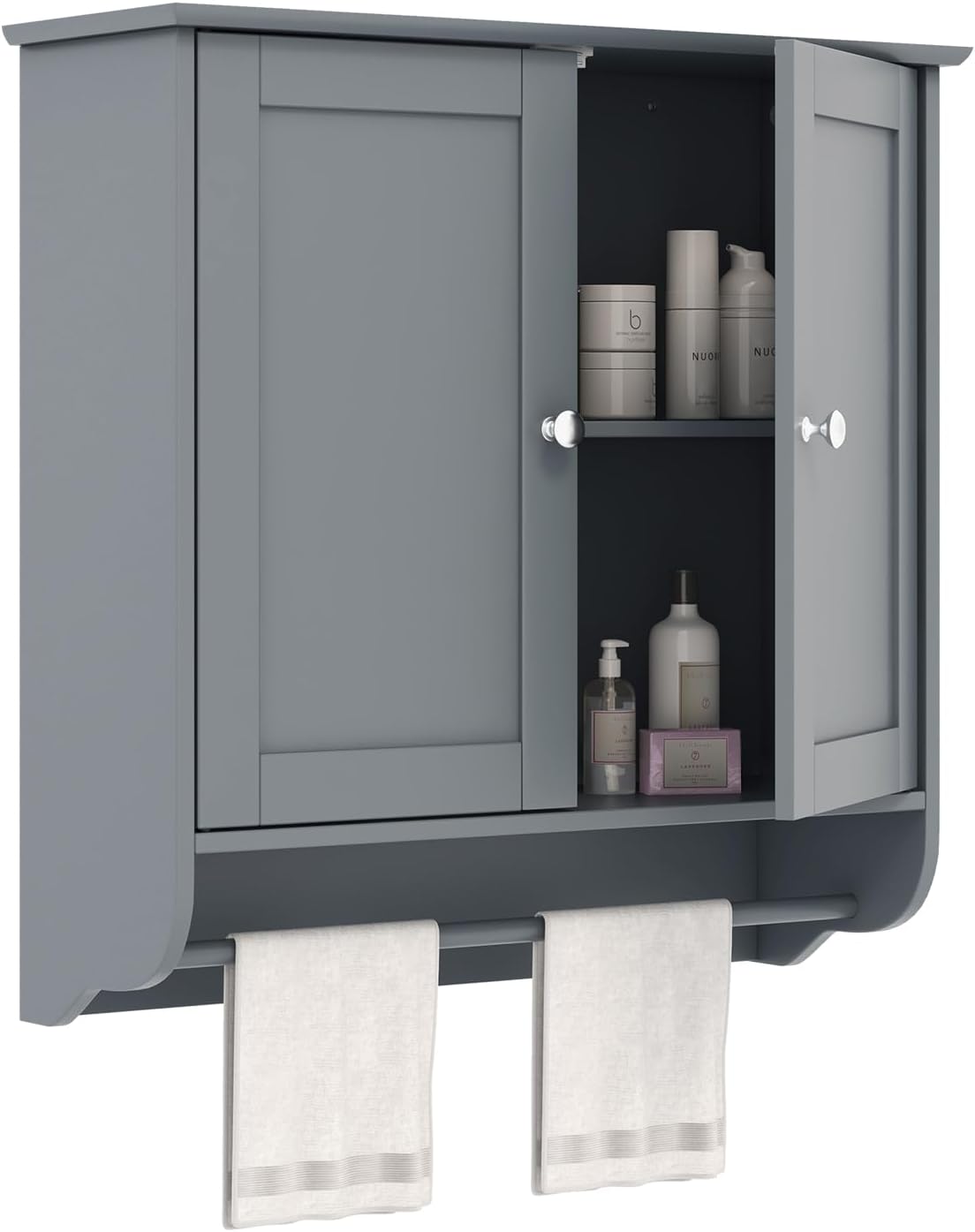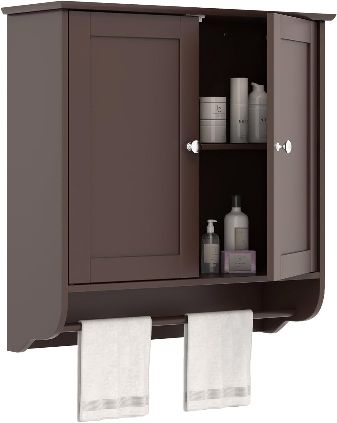 - Adjustable Shelf & Towels Bar: The shelf inside the bathroom cabinet can be adjusted in 3 heights and the adjustable range between each height is 1.3"/3.2 cm. You are allowed to easily adjust the shelf to meet your different storage needs, such as shampoos, and razors, and display things you need in hand. A towel bar is designed for towels, ties, and so on.