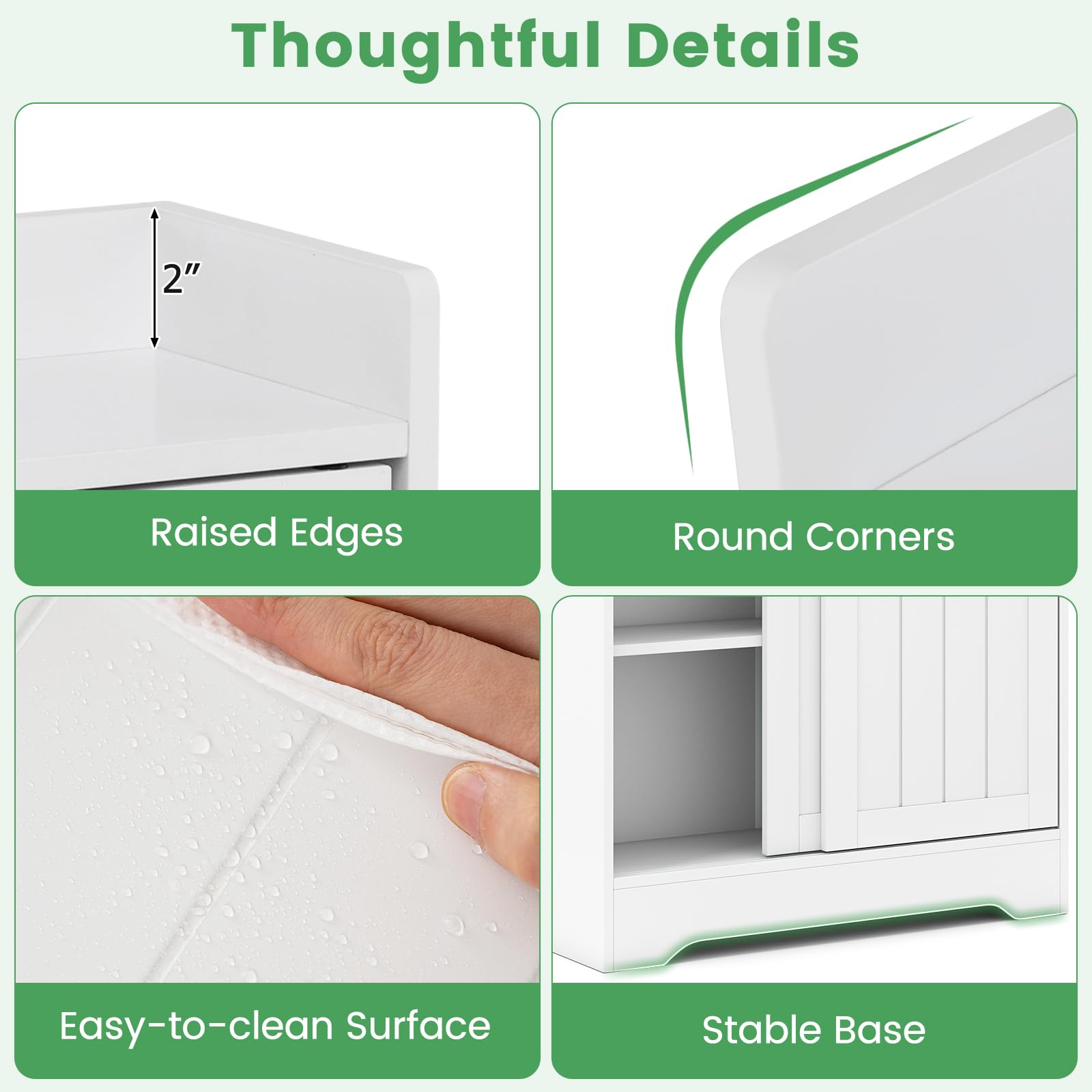 Crafted for small spaces, this slim storage cabinet features a sleek design that fits neatly next to your toilet or any corner, making it a versatile solution for bathrooms, living rooms, kitchens and more. 2 smooth sliding doors make it easy to access stored items while saving space. Inside, you'll find 2 adjustable shelves that provide flexible storage options, keeping items of varying sizes neatly organized. Additionally, this bathroom cabinet includes 2 toilet paper holders and a dedicated compartment for a toilet brush, enhancing convenience. For added safety, the cabinet features an anti-toppling kit at the back and anti-falling edges on the top.