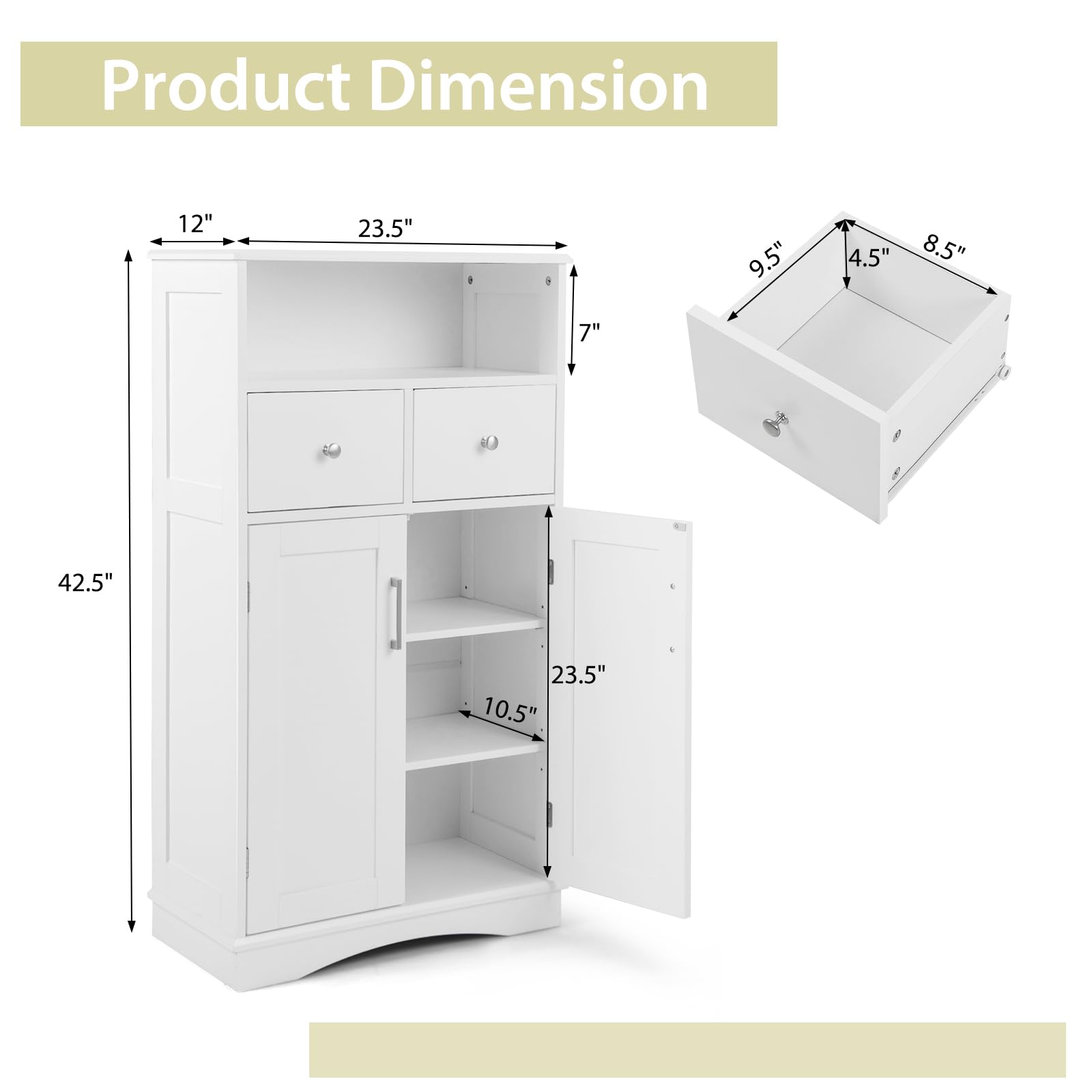 - Abundant Storage Solutions: Our storage cabinet offers ample storage options to accommodate various items. It features a spacious tabletop, an open storage compartment, 2 drawers, and a 3-tier cabinet. With these multiple storage compartments, you can easily organize and store your bathroom essentials. The product dimensions are 23.5" x 12" x 42.5" (L x W x H), providing generous space for your belongings.