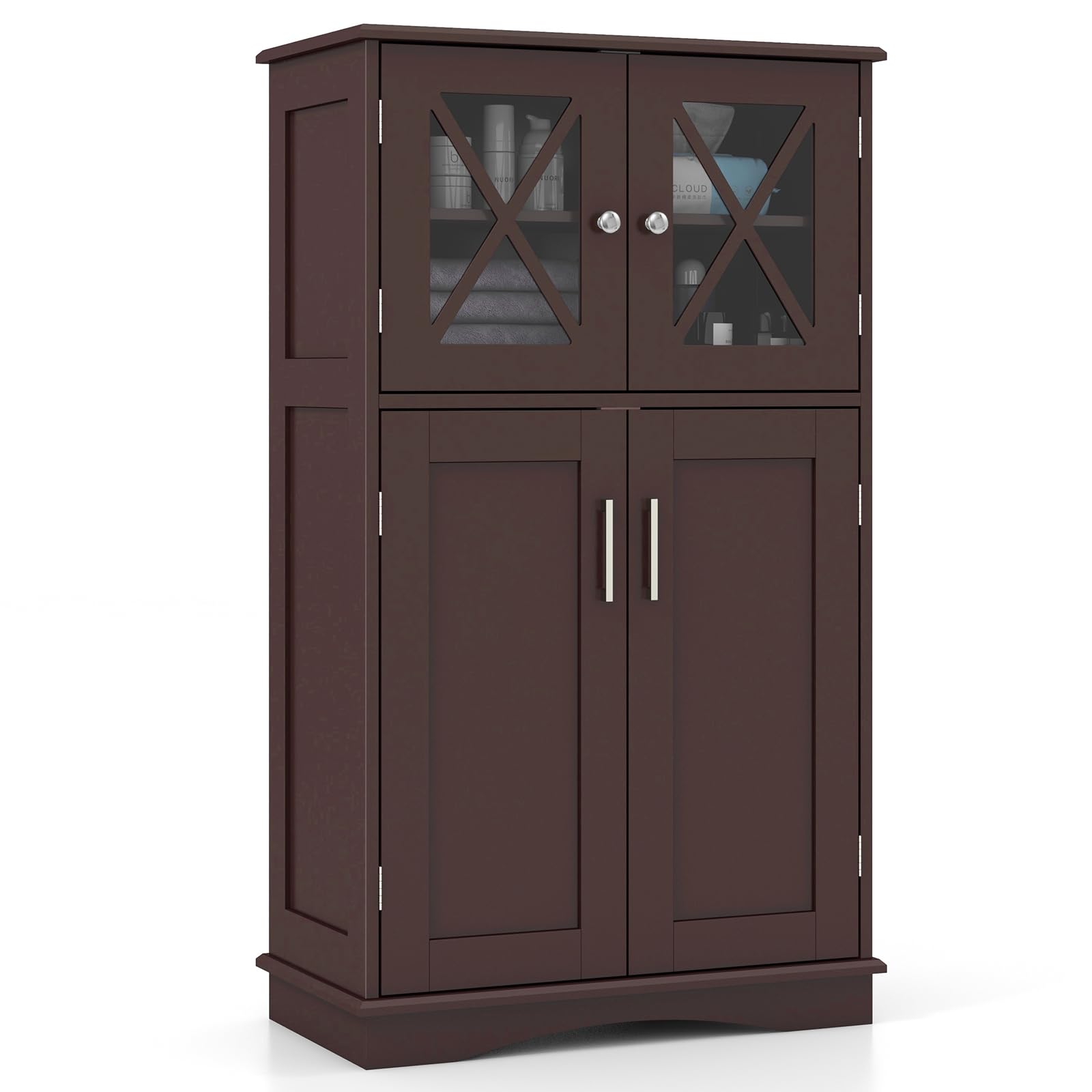 This 5-tier storage cabinet offers large storage space for various items. Plus, there are 3 height adjustable shelves inside the cabinet and each of them can be adjusted in 3 levels, which allows you to freely adjust the shelf to fit items in different heights. Also, this floor cabinet is designed with 2 glass doors, which are good-looking and convenient to find things you want. For added security, this bathroom storage organizer can be fixed to the wall with included anti-toppling devices.