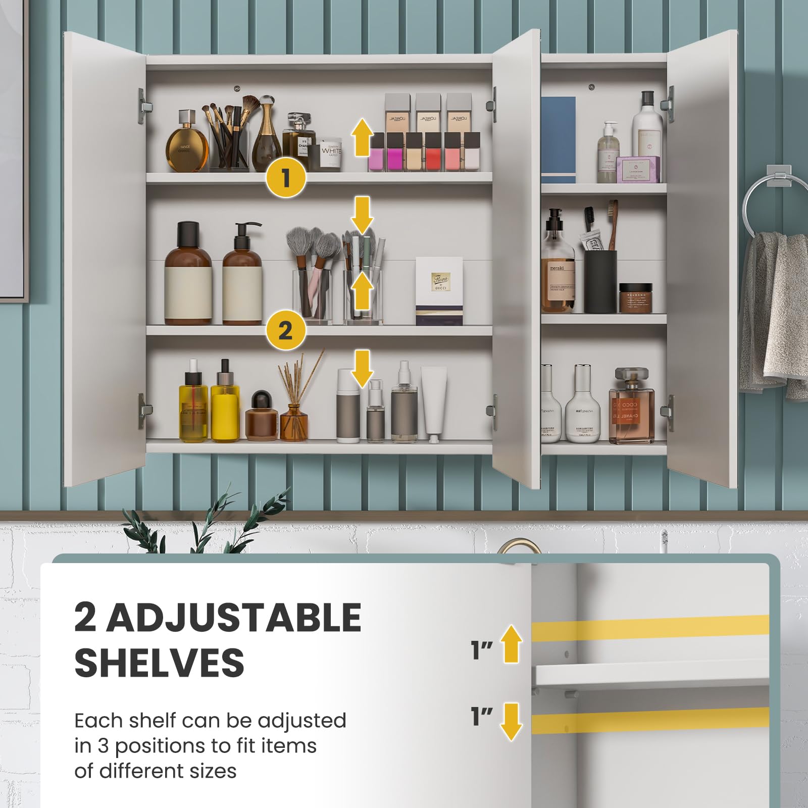 - Versatile and Tailored Storage: Elevate your bathroom organization with our medicine cabinet's adjustable brilliance. It boasts two adjustable shelves, each with three positions to cater to items of all sizes. From toiletries to towels and roll papers, every bathroom essential finds its designated home within this well-thought-out space.