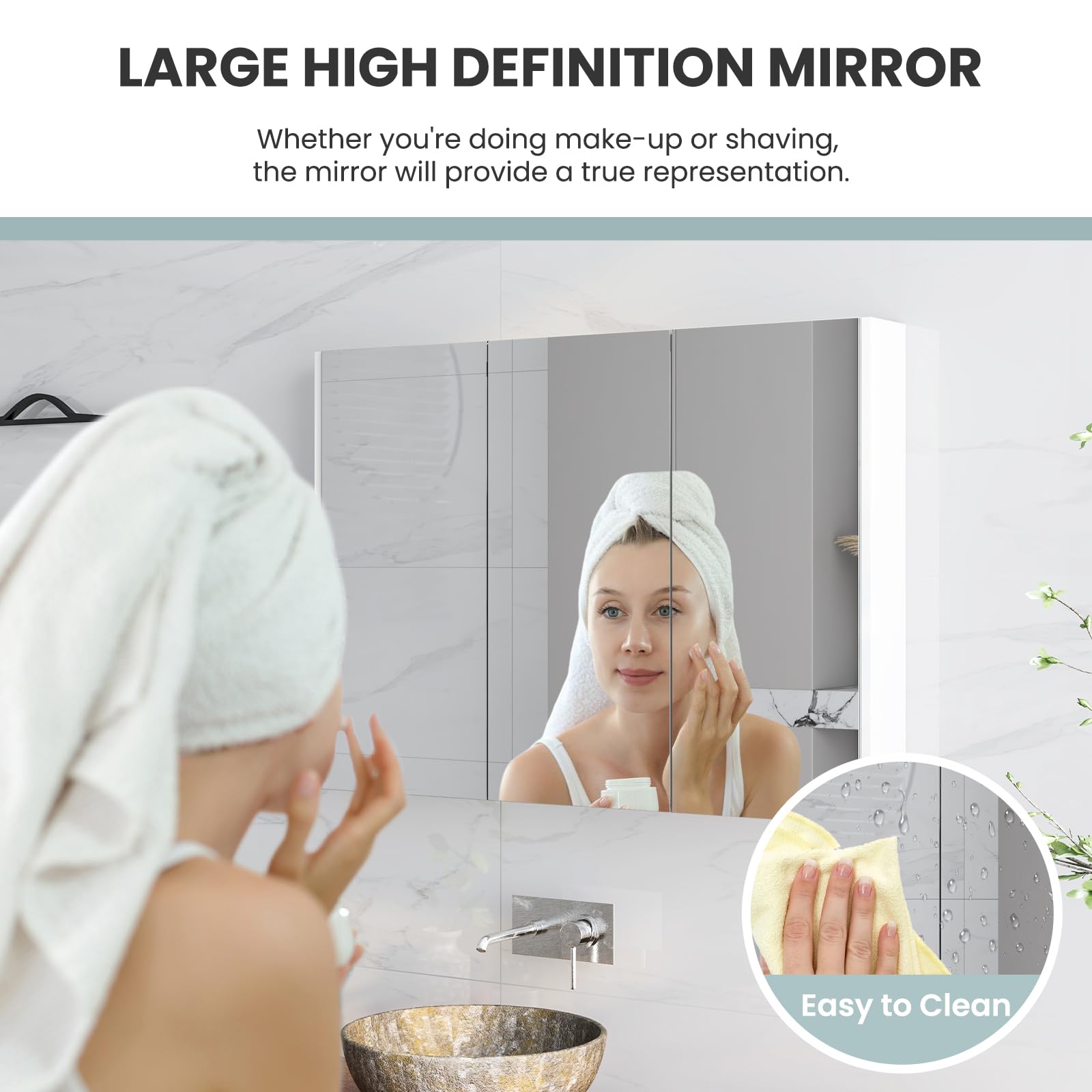 - Frameless Mirrored Elegance: Behold the striking elegance of three frameless mirrors harmoniously coming together to create a high-definition masterpiece. Whether it's perfecting your makeup or achieving a precise shave, this mirror offers an accurate reflection. Cleaning is a breeze too, as water stains simply wipe away from the mirrored doors, maintaining clarity effortlessly.