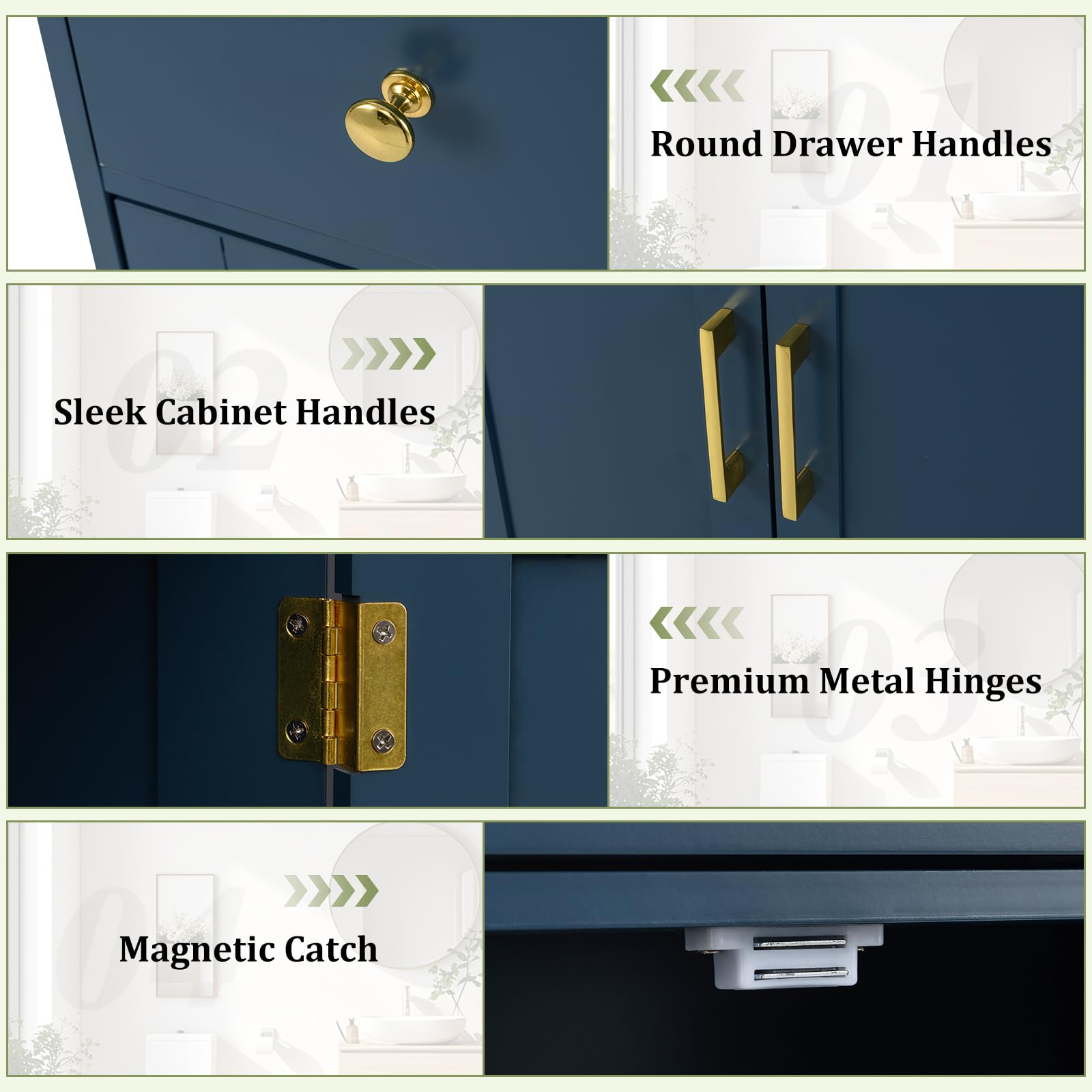 This kitchen storage cabinet offers ample storage with a spacious tabletop, large drawer, and enclosed cabinet. The adjustable shelf allows customization for various items. With an anti-toppling device, this standing cabinet ensures safety and stability. The elegant design, complete with golden handles and hinges, adds sophistication to any room while providing practical storage solutions.