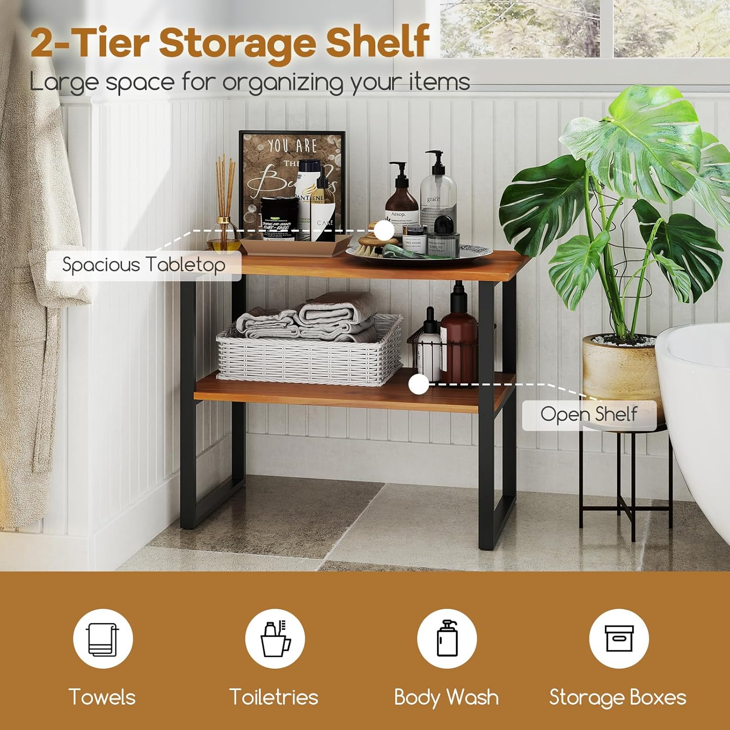 This multipurpose freestanding open shelf organizer features 2 spacious tiers that provide ample room to store and display towels, toiletries, books, and decorative items. It is expertly crafted to blend seamlessly into any room, including bathroom, living room, dining room and more. The natural and sturdy teak construction makes it an enduring and elegant addition to your living space. Moreover, this wooden display shelf is equipped with waterproof finish for easy cleaning and anti-slip foot pads to protect your floors from scratches.