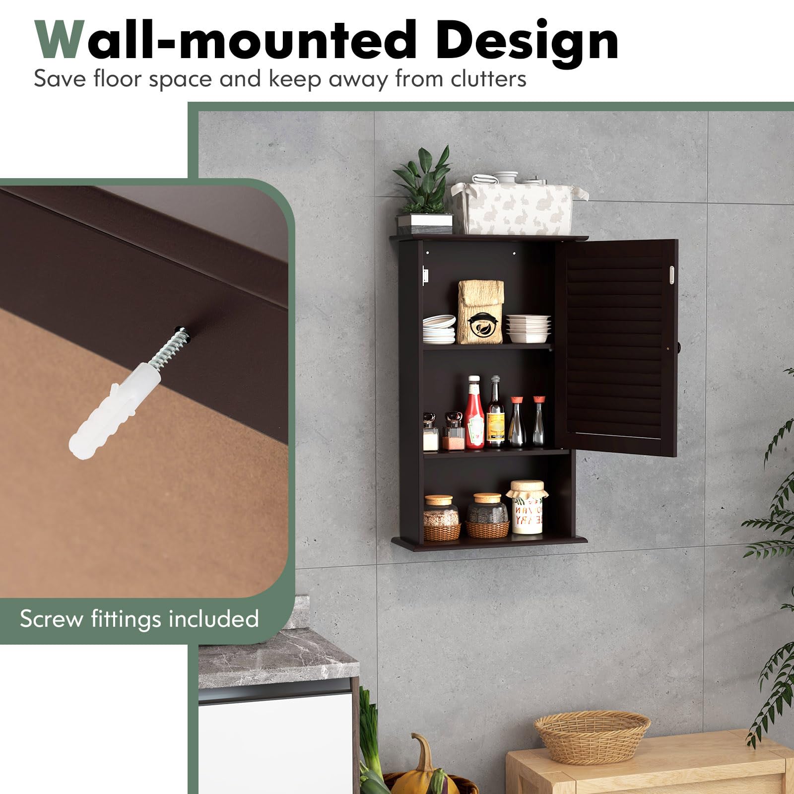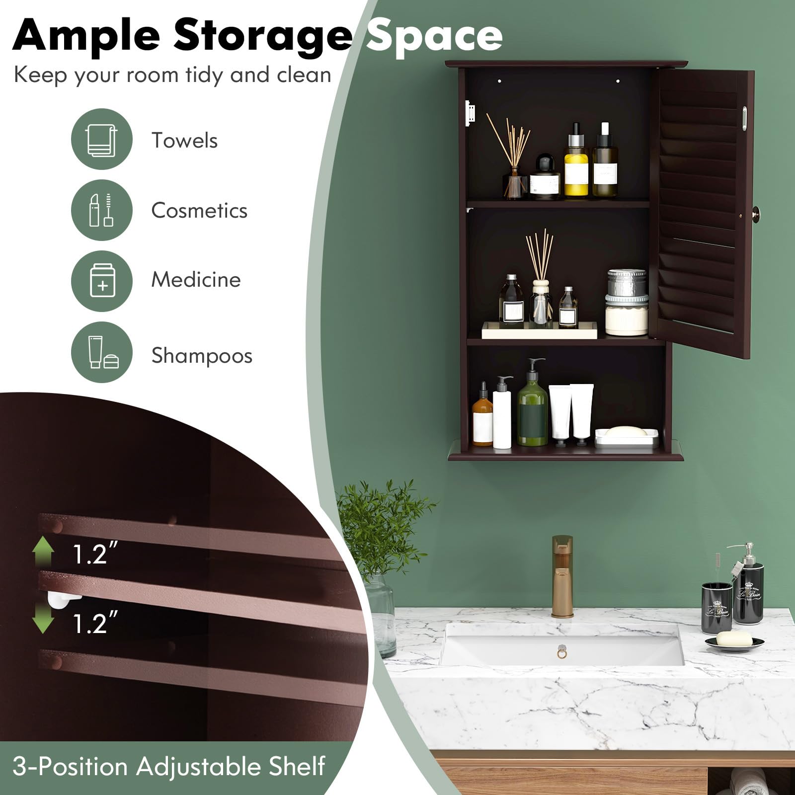 Looking for a practical and stylish solution to keep your room tidy and clean? This single-door bathroom wall cabinet is the perfect answer. Made from high-quality materials, the wall cabinet is easy to install and maintain. And this compact cabinet is wall-mounted, freeing up valuable floor space and expanding your storage options. With 3 shelves, you'll have plenty of space for bathroom essentials, like shampoos. The detachable middle shelf's?position can be adjusted at 3 levels, which provides ultimate flexibility to accommodate a variety of items. Besides, the louvered door adds an extra touch of elegance, while the convenient knob and magnetic door catch ensure easy use.