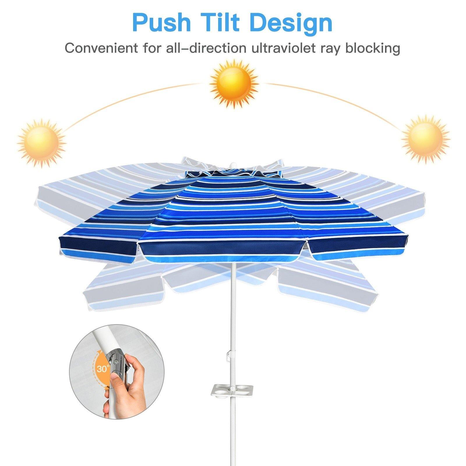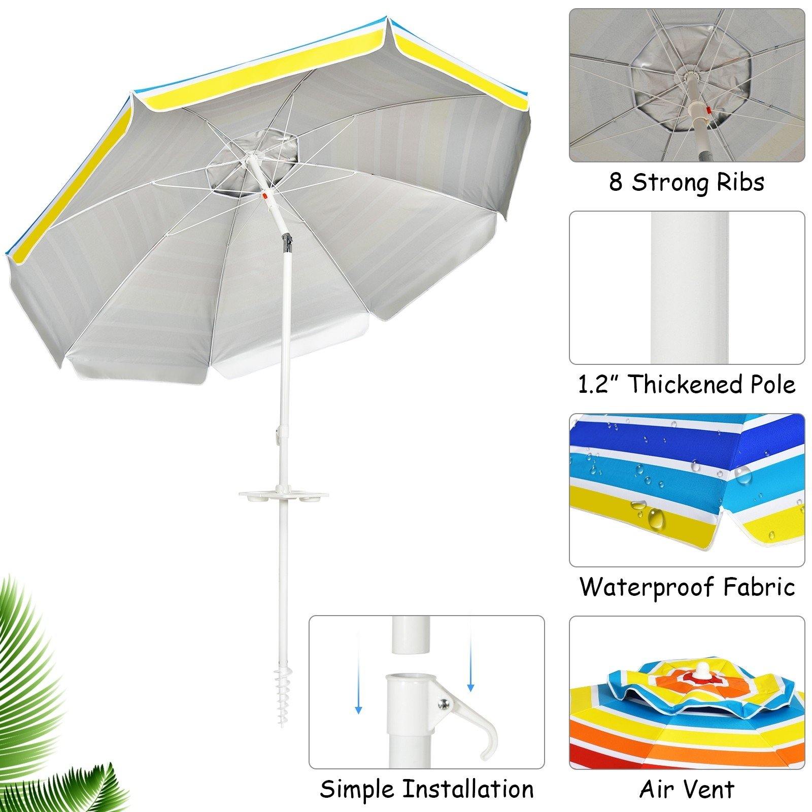 Canopy made of silver-coated fabric effectively protects you from harmful sunlight. And the heavy-duty steel frame ensures high stability. Equipped with solid sand anchor, the umbrella is convenient to be steadily fixed on the beach. Additionally, the operation is quite easy for you. You can close the umbrella just with the top button, and adjust the umbrella angle with the locking button on the handle. Moreover, when you feel thirsty, you can immediately get your drink on the cupholder. If you are looking for a patio umbrella for outdoor activities, this beach umbrella will be a fabulous choice.