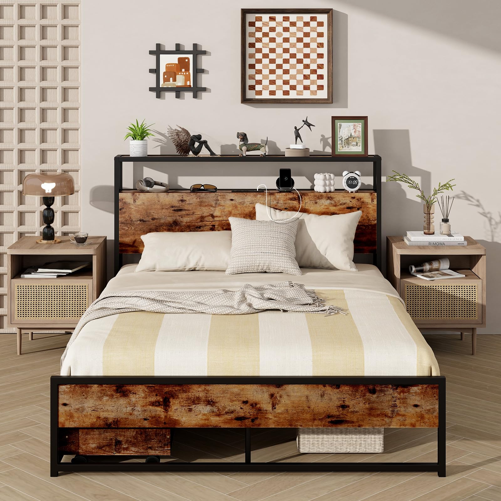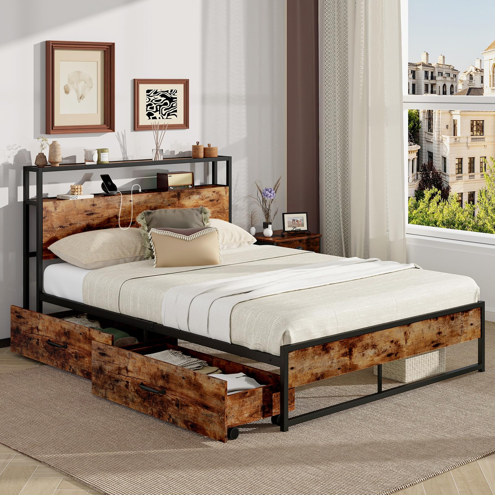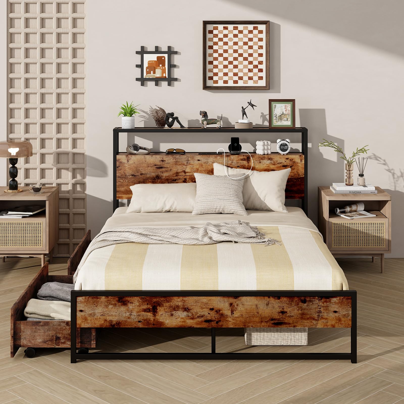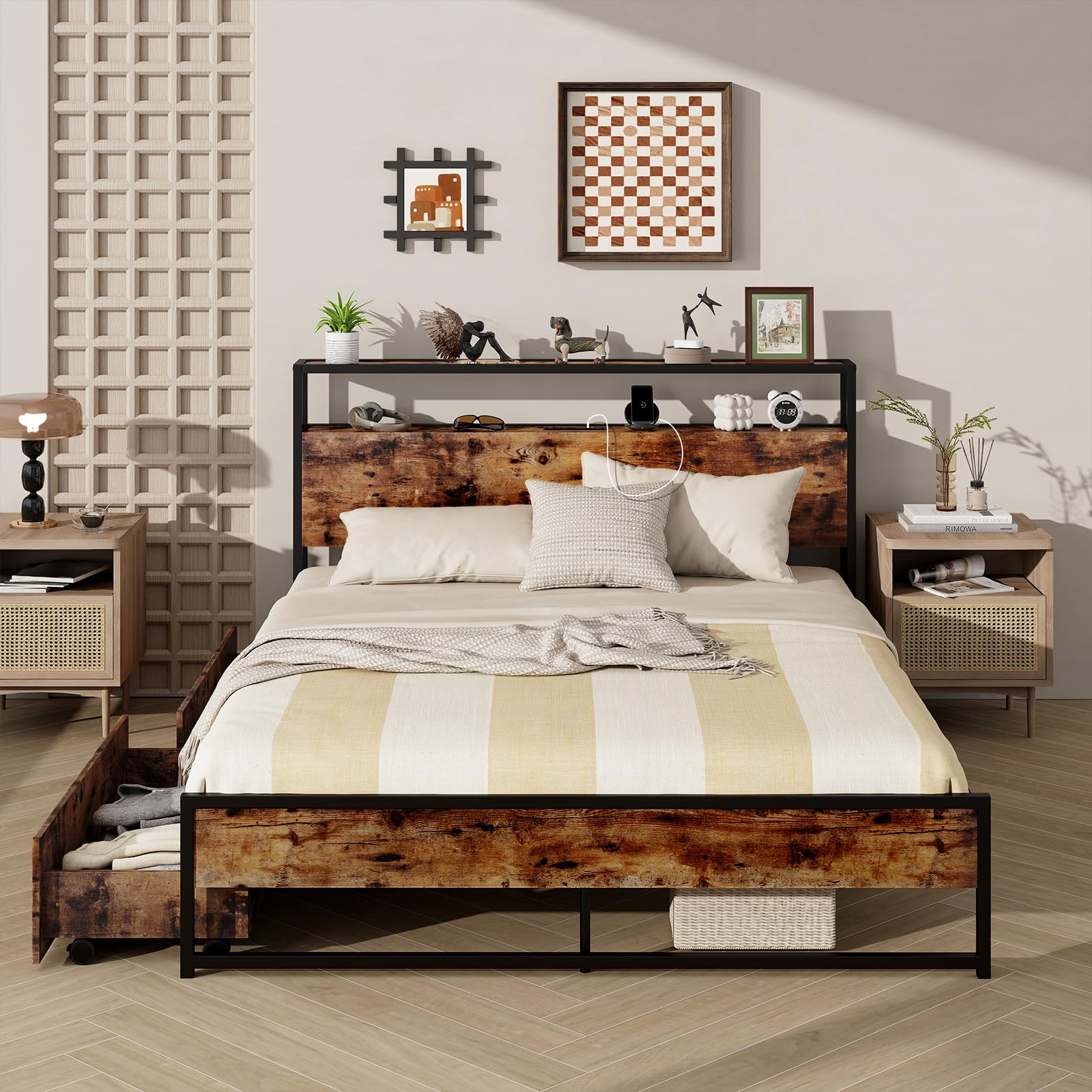 If you’re looking for a bed that blends functionality with style, this metal platform bed is an ideal choice. The headboard includes 2 power sockets and 2 USB ports, offering fast charging options for various electronics while keeping daily essentials within easy reach. Constructed with solid metal slats, the bed frame boasts impressive sturdiness and durability, supported by robust legs that ensure long-lasting stability. Additionally, the two large drawers on casters provide convenient storage for clothing and other items, gliding smoothly for easy access. With its clean lines and industrial design, this bed adds a modern touch to any room and enhances the overall aesthetic of your living space.