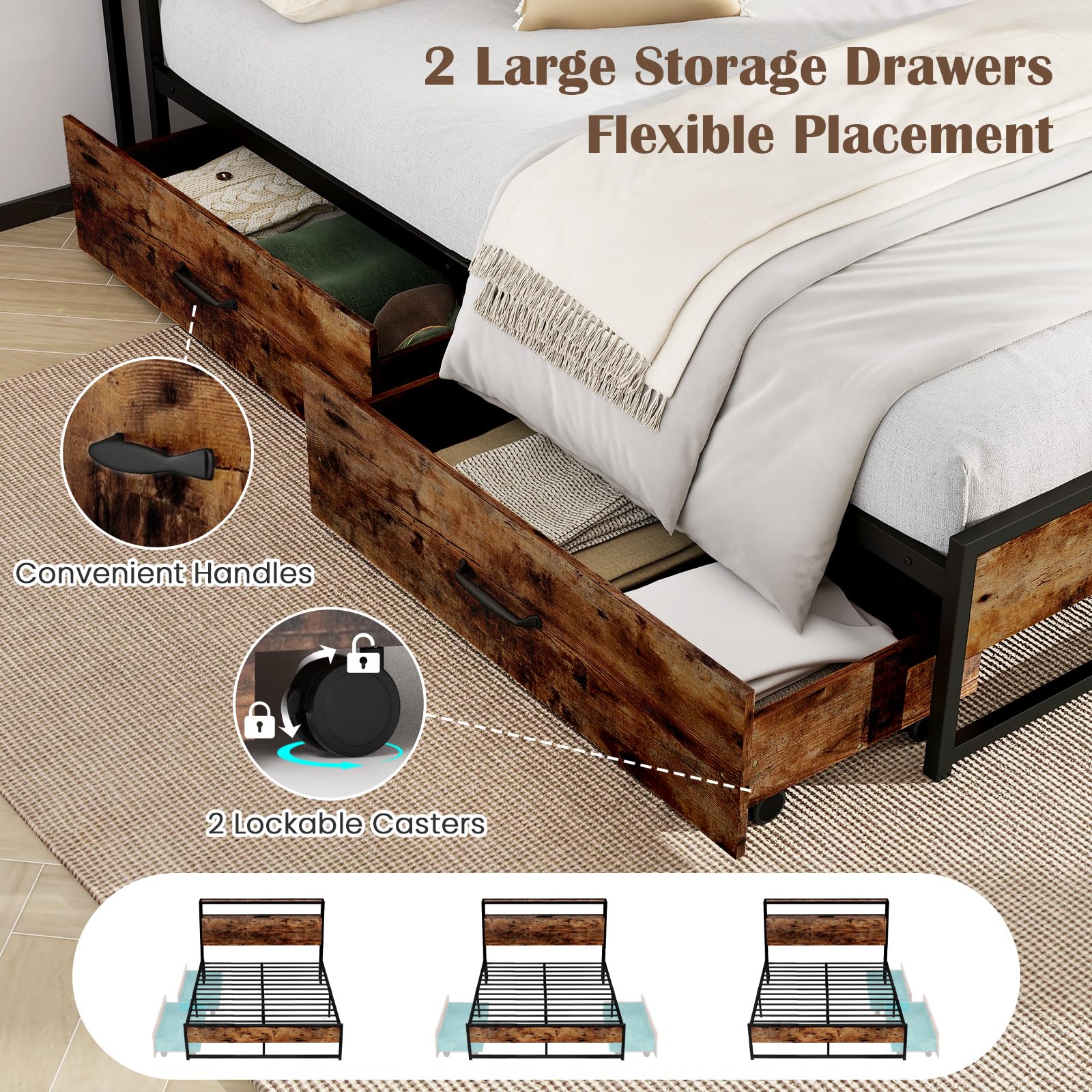 2 pull-out drawers provide ample storage space for clothes, bedding, and more