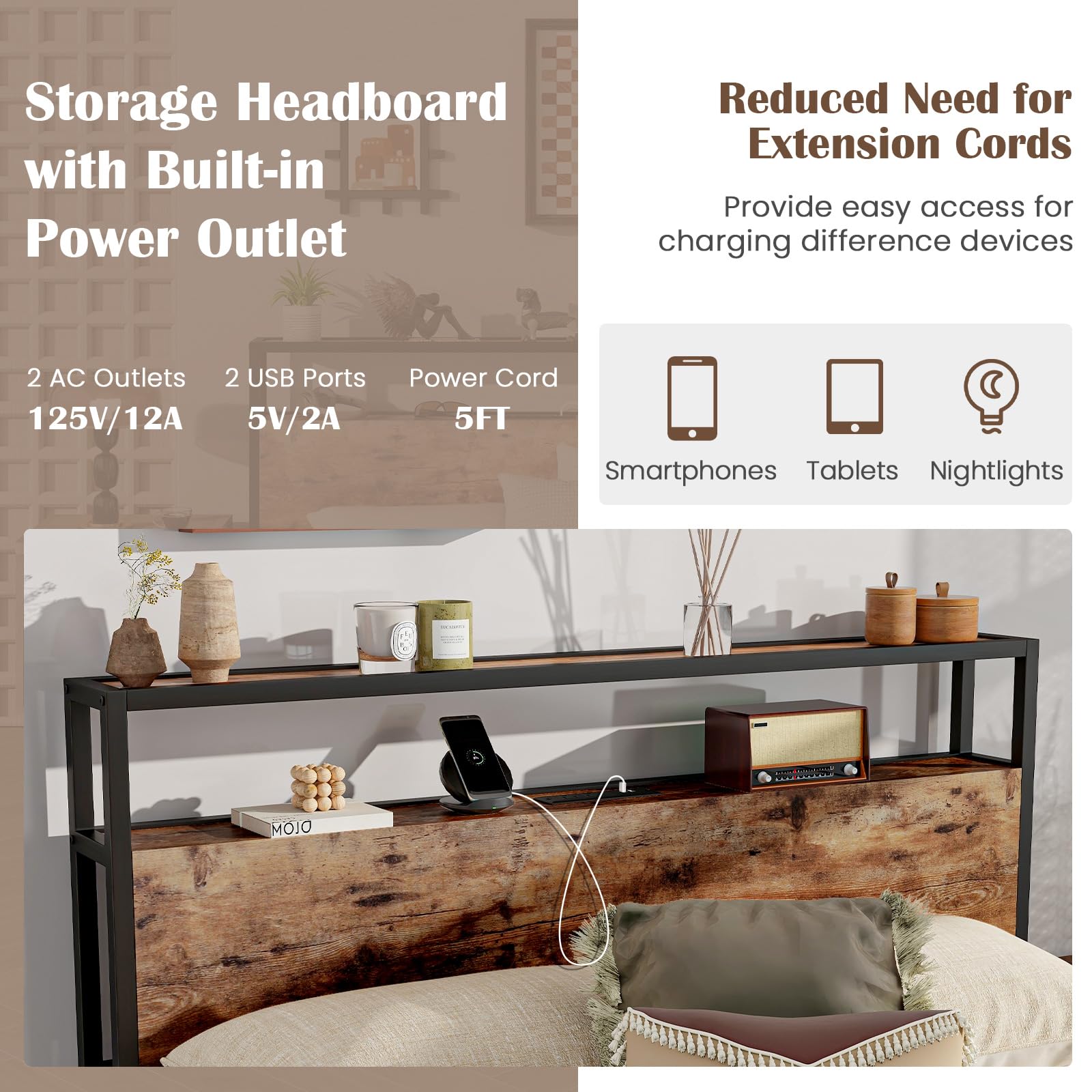 Headboard with 2 shelves for easy access to your bedtime essentials