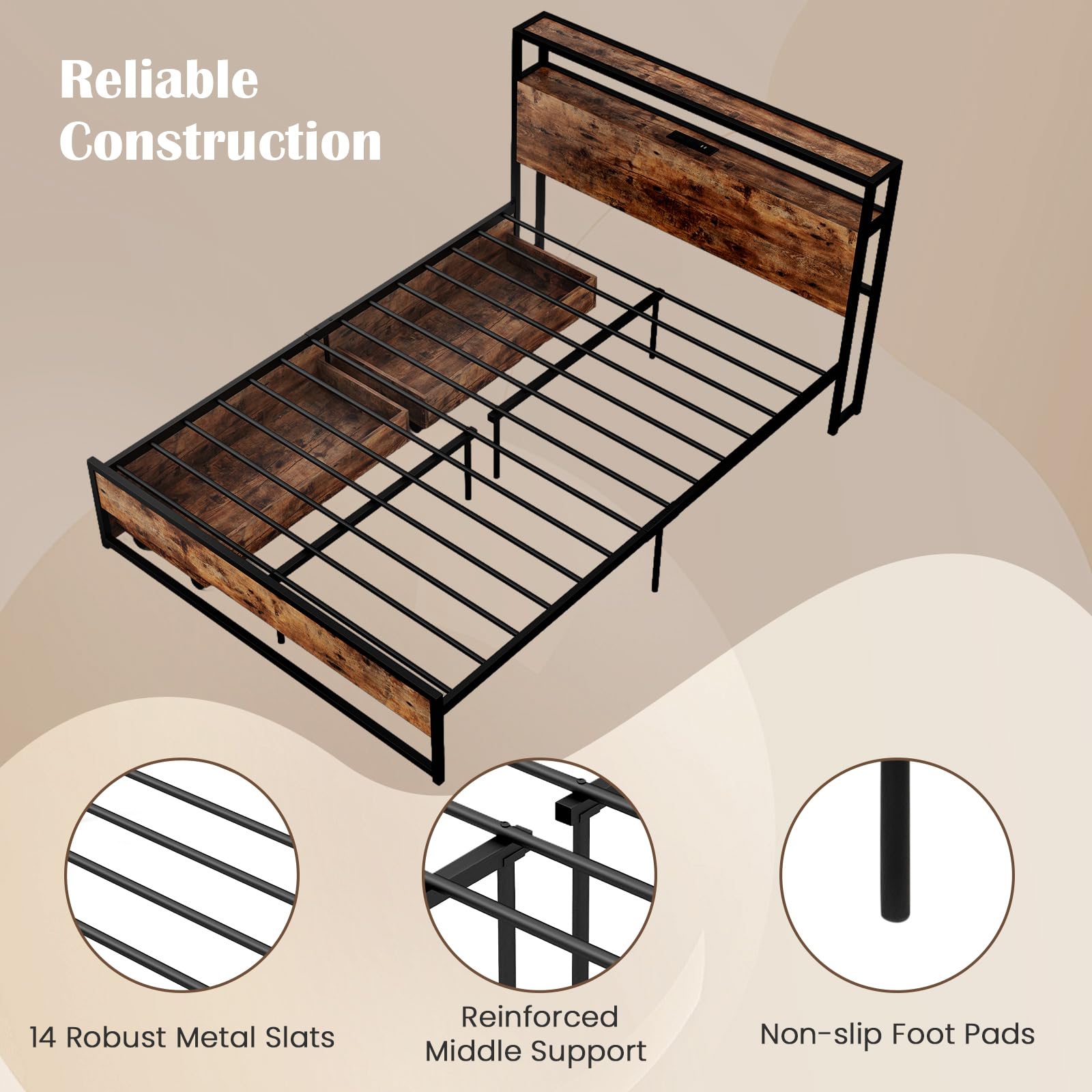 Sturdy metal slats offer reliable support for the bed frame