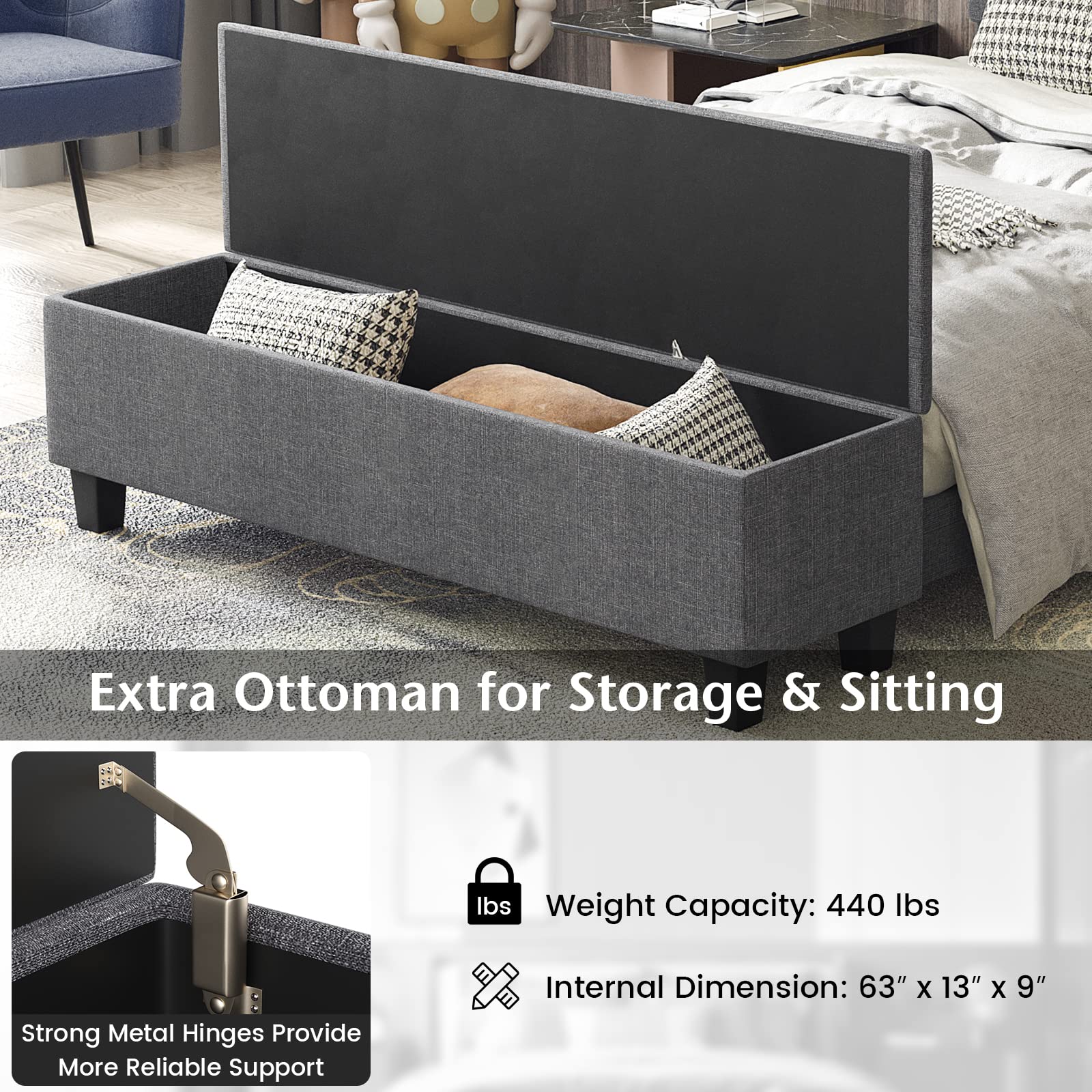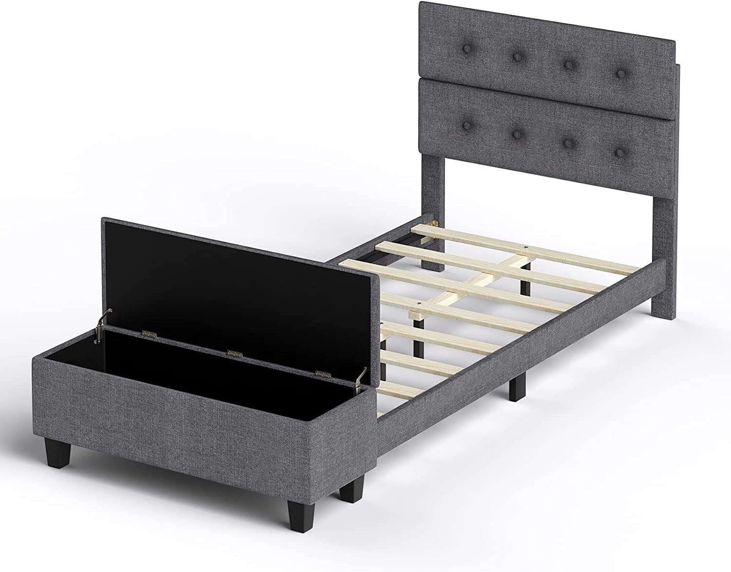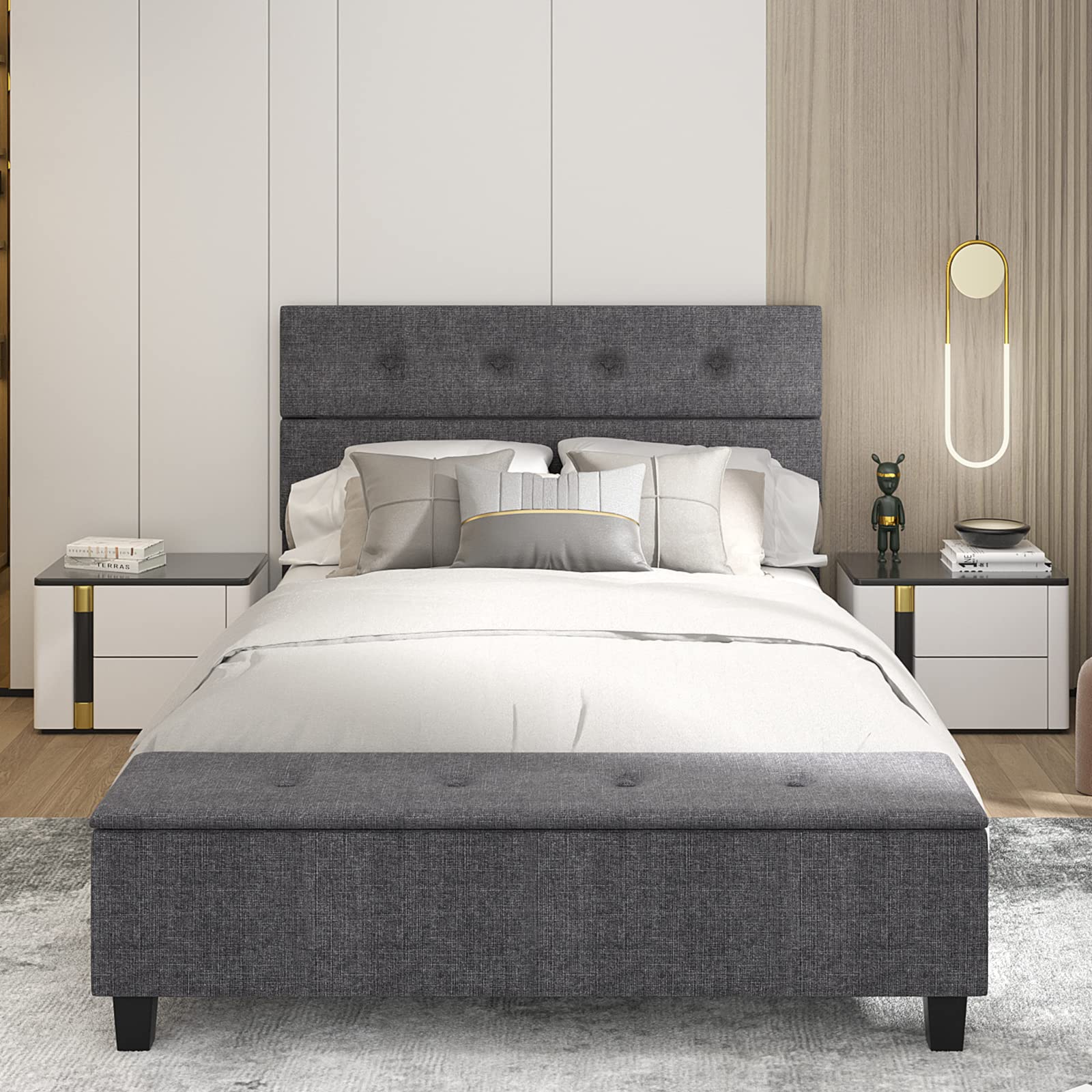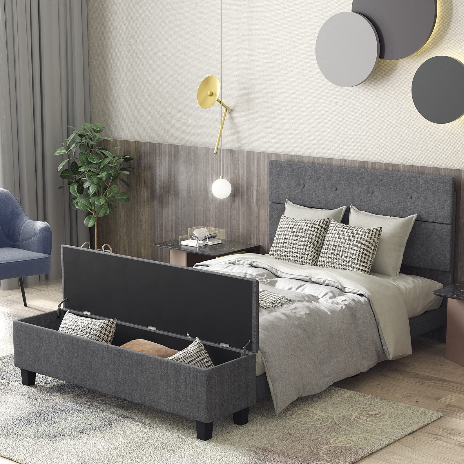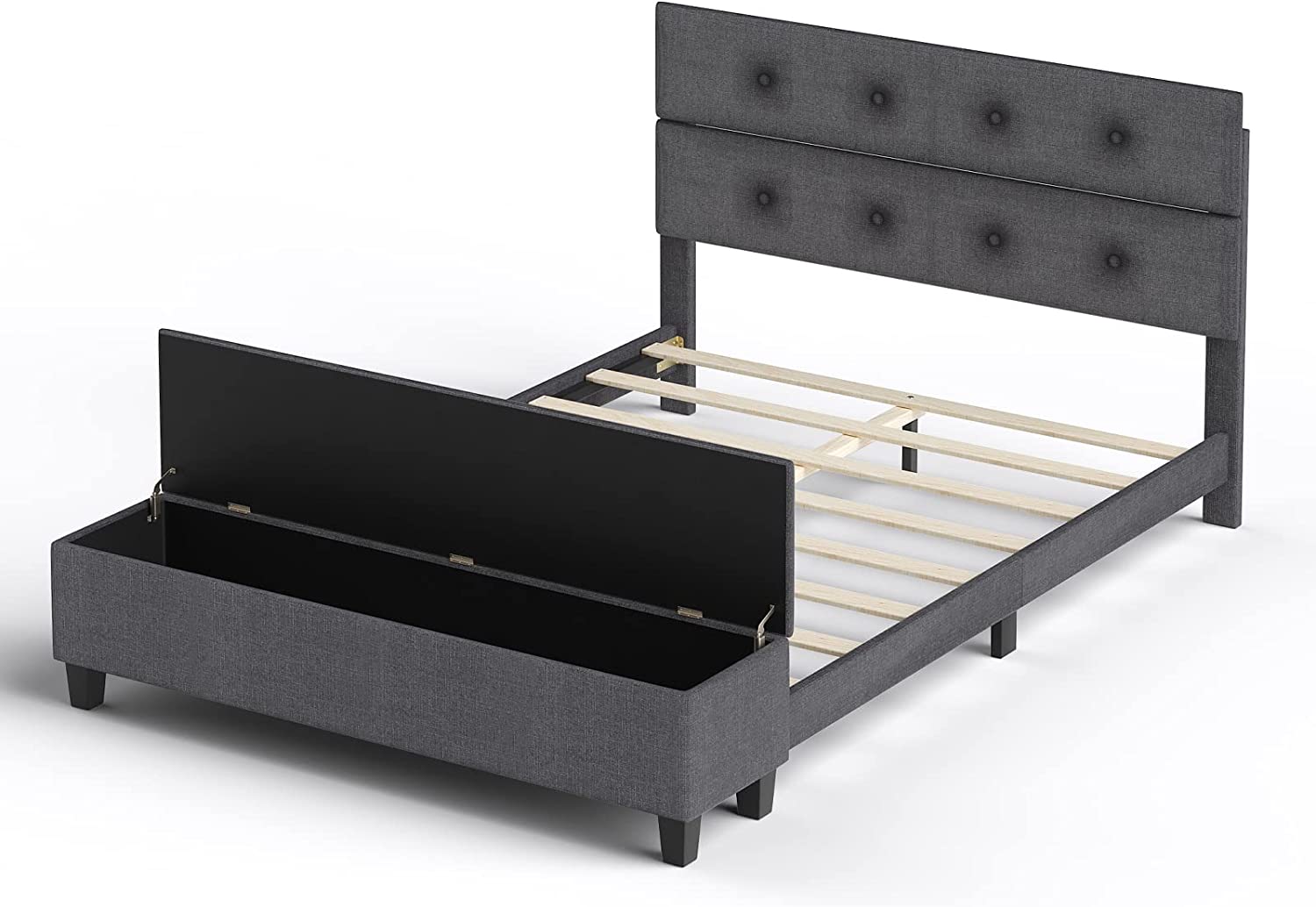 This classically styled, sleek-looking upholstered bed is easy to coordinate with any style of the room. The beautifully tufted headboard not only looks elegant but also keeps you in the most comfortable position while you're reading or watching TV. There is also a storage ottoman at the end of the bed, where you can place some daily necessities for convenient access. Besides, it is worth mentioning that the bed frame has 8 firm slats and support legs. The sturdy construction gives our upholstered bed a weight-bearing capacity of 880 pounds.