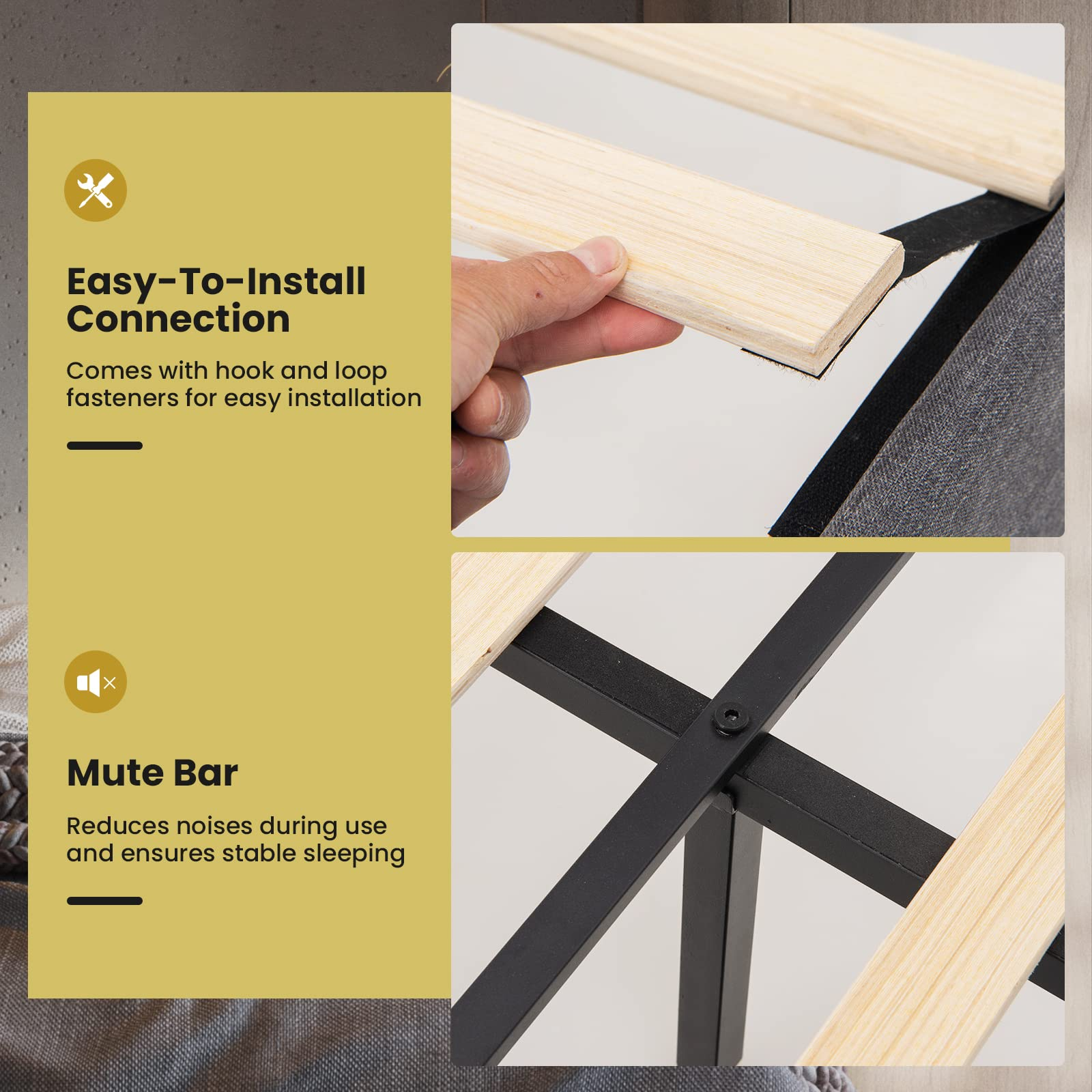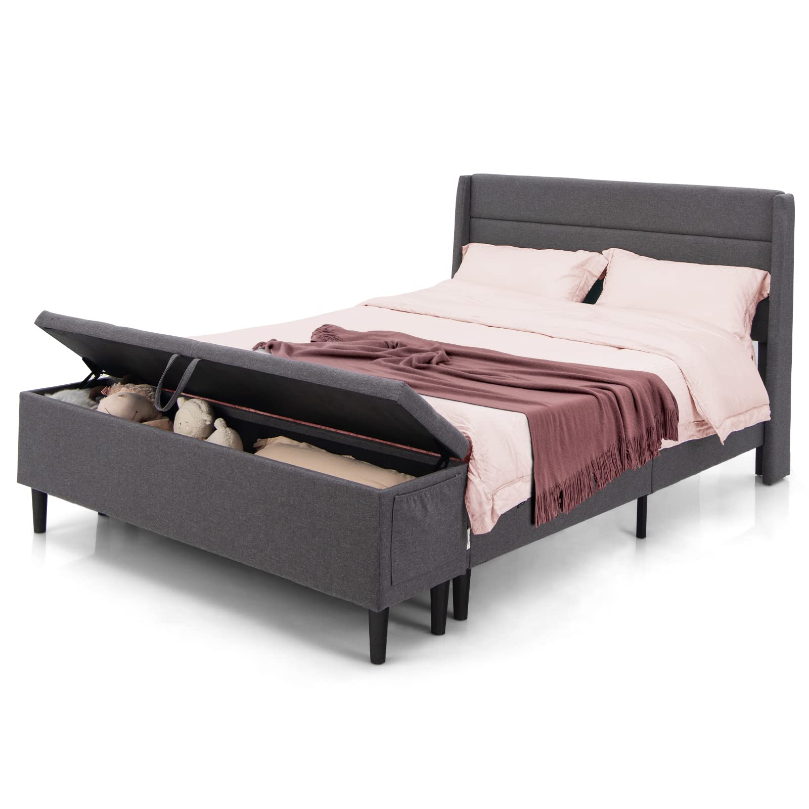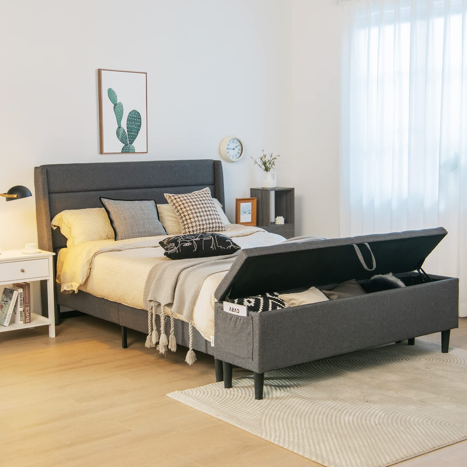 The whole frame is made of rustproof steel for a strong load capacity of 660?lbs. And it is covered with linen fabric and filled with sponge for very soft touch. During sleeping, its mute bar will highly reduce frictions and noises. The anti-slip legs and adjustable pads ensure a stable structure without wobbling. What's more, the end storage ottoman is a perfect addition to accommodate your clothes, bed sheets, toys and more. Its side pockets can store your preferred magazines. With a fabric handle and supportive springs, the opening is very convenient. Plus, a 6.5" under-bed clearance is also perfect for sundry storage and easy sweeping. Thanks to a platform design, there is no need for a box spring. The hook and loop fasteners also help simplify the whole installation.