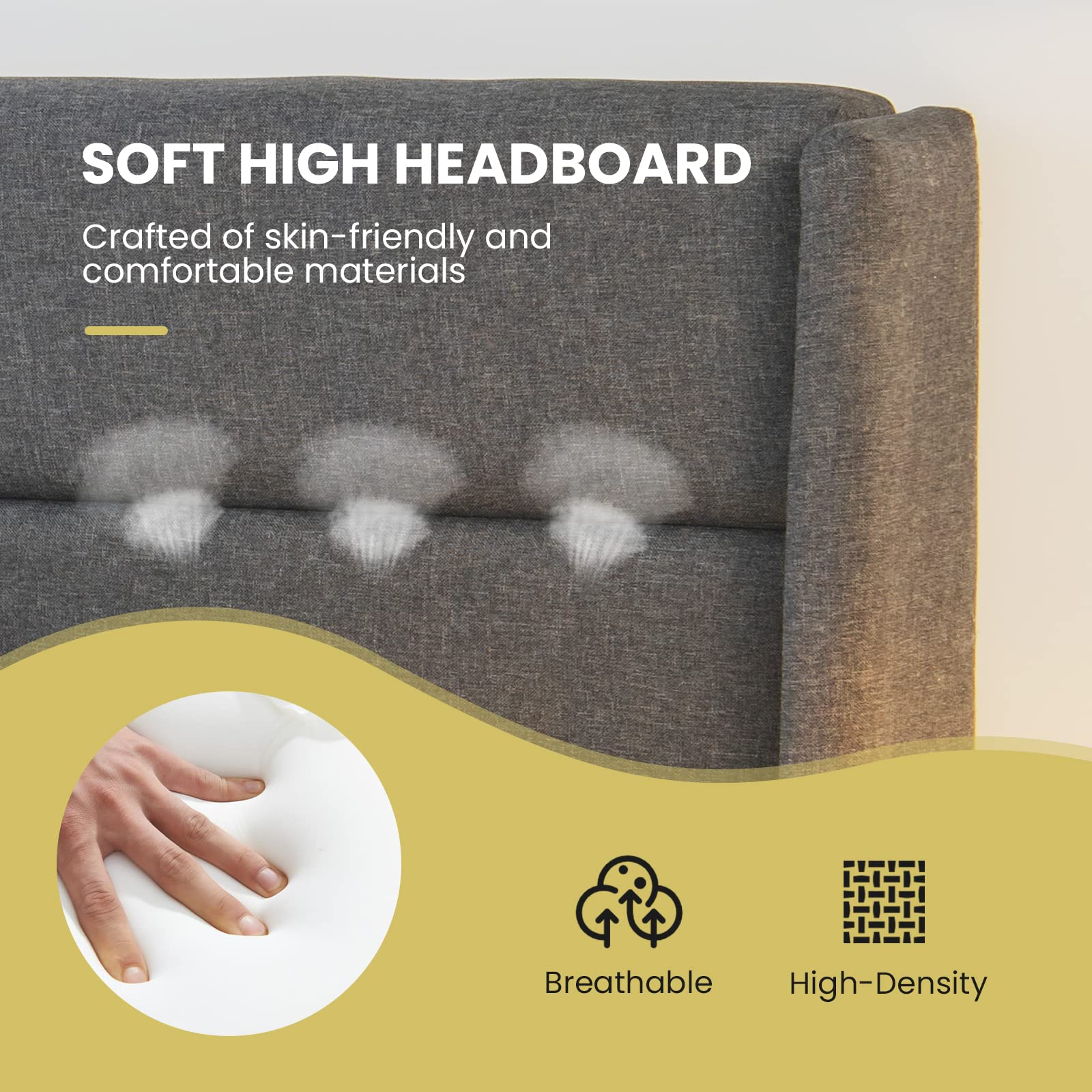 High headboard covered with linen fabric and filled with sponge for a soft touch