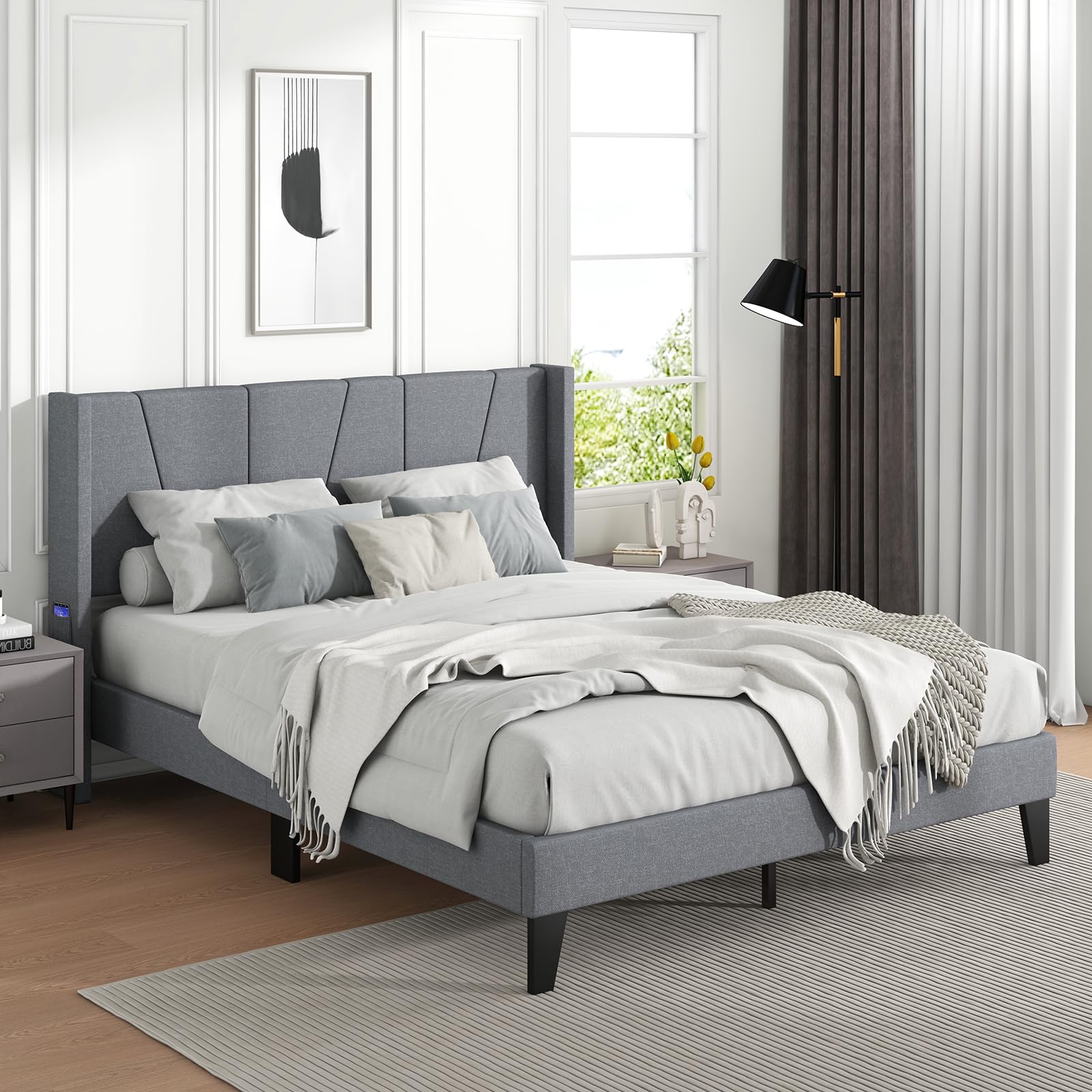 Enhance your bedroom with our spacious upholstered platform bed, offering both comfort and ample storage. The bed features soft sponge padding and breathable linen fabric for superior comfort, and a stylish wingback design for relaxed leaning. Equipped with two handy side pockets and 6.5 inches of under-bed space, this bed frame helps you neatly organize your essentials. Built to support up to 800 lbs, its robust design includes thickened legs and extra metal supports for outstanding stability. Anti-slip and adjustable foot pads further ensure the bed remains stable on any surface. Designed for practicality, this platform bed does not require a box spring and is ideal for mattresses 8 to 12 inches thick.