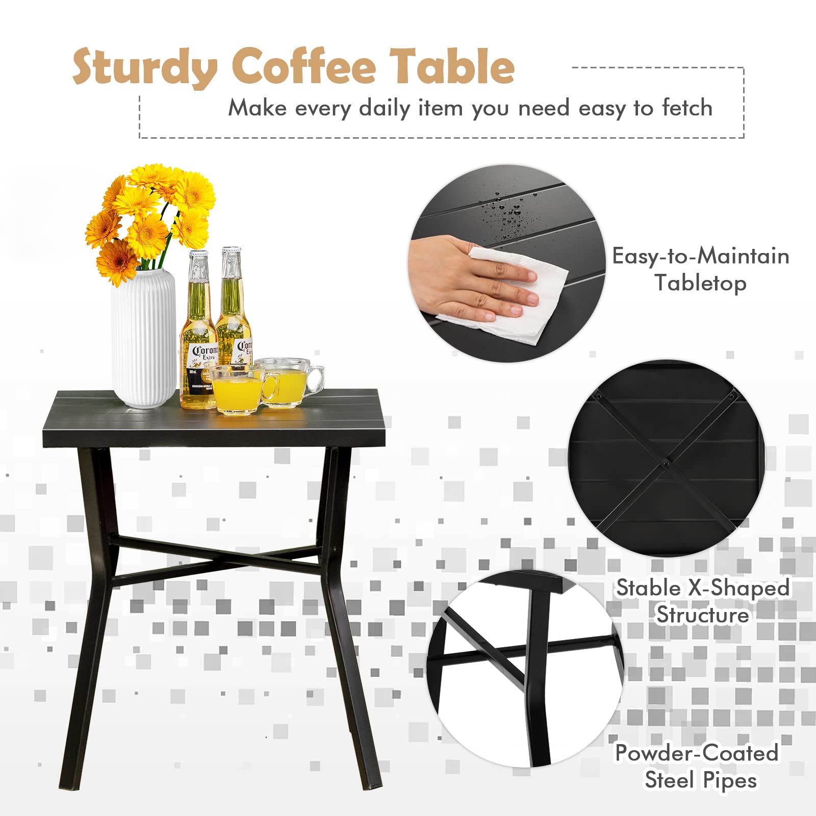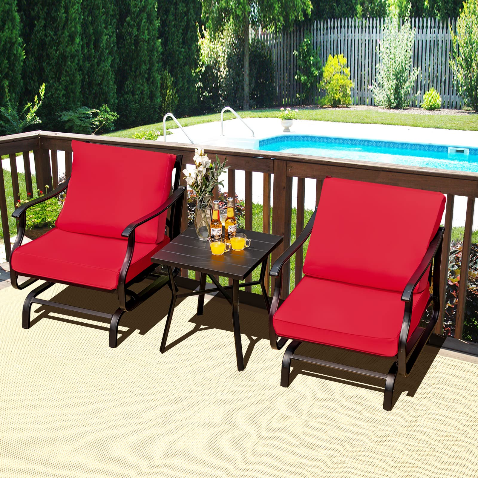 Featuring gentle rocking motion and an ergonomic seat, the two patio chairs will make you fully relaxed. The seat and back cushions filled with a high-density sponge are quite soft and elastic, offering more comfort. And the zippered design makes it easy to remove and wash the cushion cover. Furthermore, both outdoor chairs and coffee tables are super sturdy with heavy-duty steel frames. The well-coated surface keeps the steel pipes away from rust. The surface of the coffee table is waterproof and smooth, which makes maintenance quite simple.