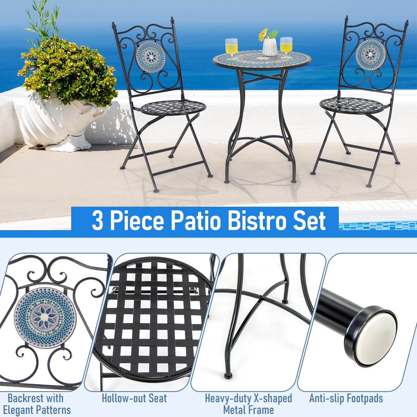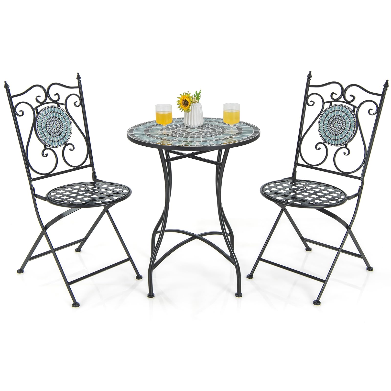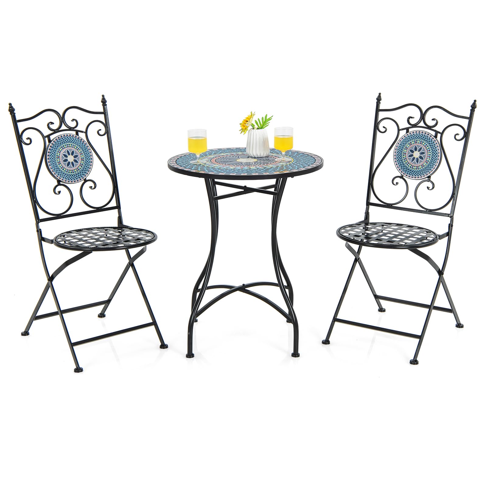 With heavy-duty metal frame, the table and chairs are built to withstand the test of time. And the chairs with backrest provide utmost comfort for all your gatherings. The standout feature of this bistro set is the beautifully designed mosaic patterns. The intricate patterns and vibrant colors add a touch of elegance and charm to any space. When not in use, the chairs can be folded to save space, which are also portable. Overall, the mosaic bistro set is a perfect combination of style, functionality, and durability.