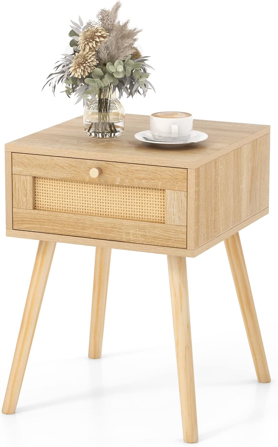 Featuring a rattan-look door and oak finish, the Boho bedside table is an attractive addition to your bedroom, living room, or hallway. It is also a perfect storage organizer to be set beside the sofa, bed, or desk, bringing extra storage space with an open top and a pull-out drawer. Say No to mess! With its handy storage space, you can keep clocks, lamps, cups, eyeglasses, and remote control well-organized. Meanwhile, the tapered wood legs not only contribute to a sturdy construction but also adds a mid-century modern flair.