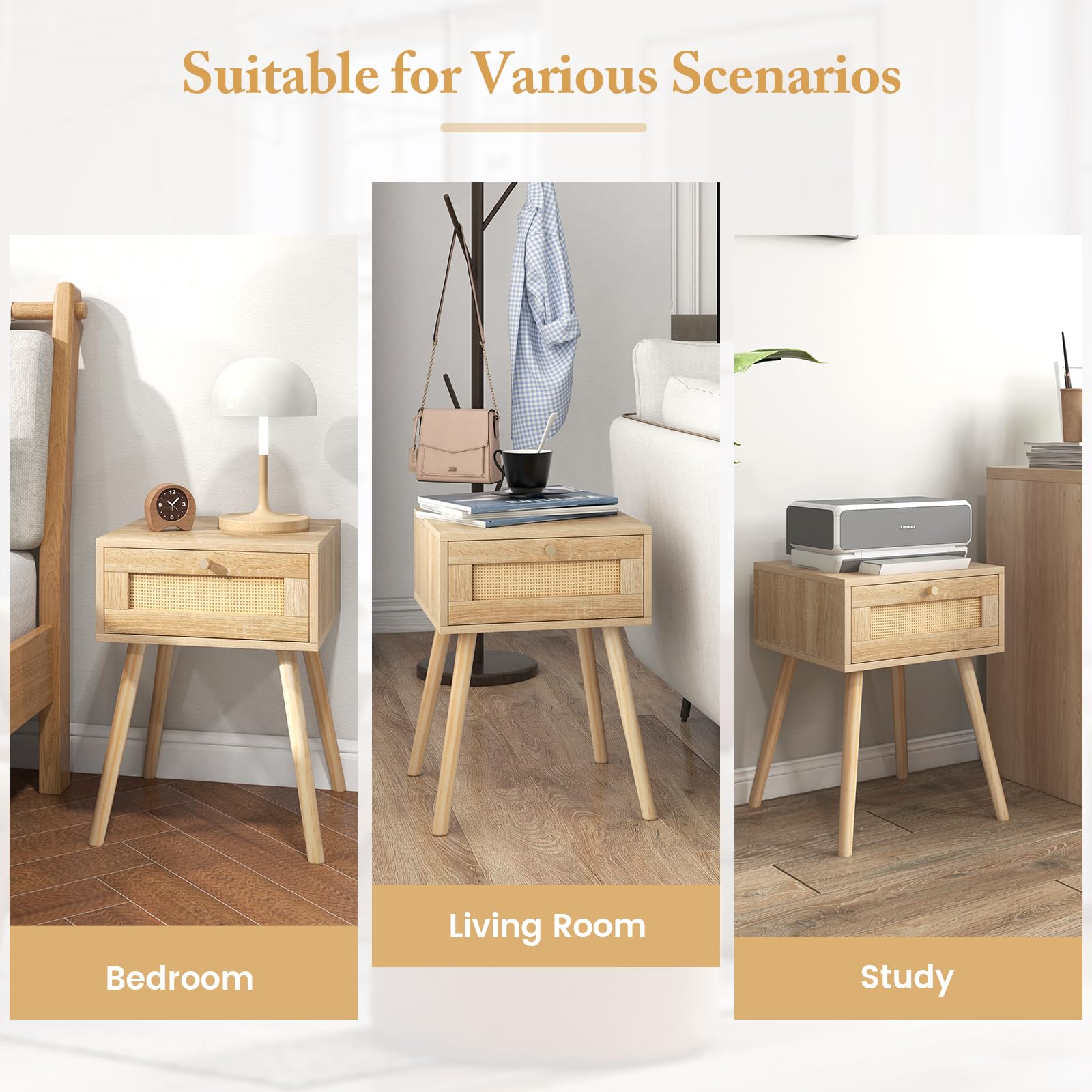 • Selected High-quality Material: The rattan nightstand is a durable and sturdy unit added to your living space. Its solid wood legs ensure reliable support (up to 135 lbs in total) for a long time. Not like metal material, the wood legs won't scratch your floor!