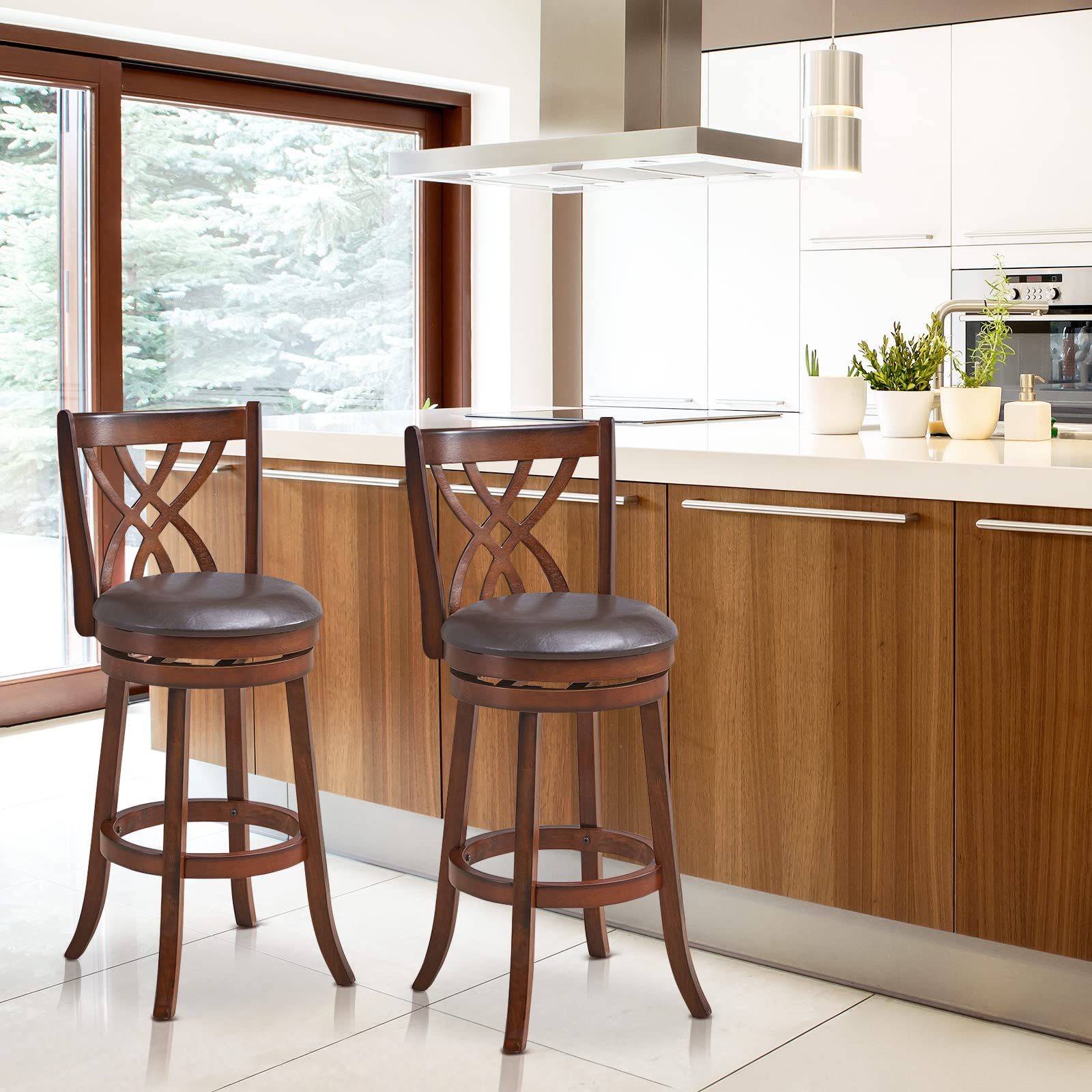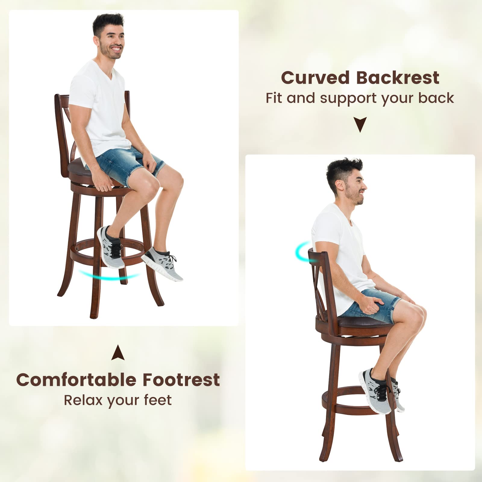 This set of wooden swivel bar stools is made of solid rubber wood, which makes the chairs have strong support and long use life. The solid legs with anti-scratch foot pads add stability and protect the floor. Sitting on the PU leather cushioned seat, you can feel comfortable. The comfortable footrest and curved backrest can relax your feet and back. With the 360° swivel design, you can freely change your position to chat with your friends in any direction. The well-crafted hollow design of the backrest makes the bar stool a spot to light up your room. They are utility addition to the kitchen island, dining room, restaurant, coffee shop, etc.
