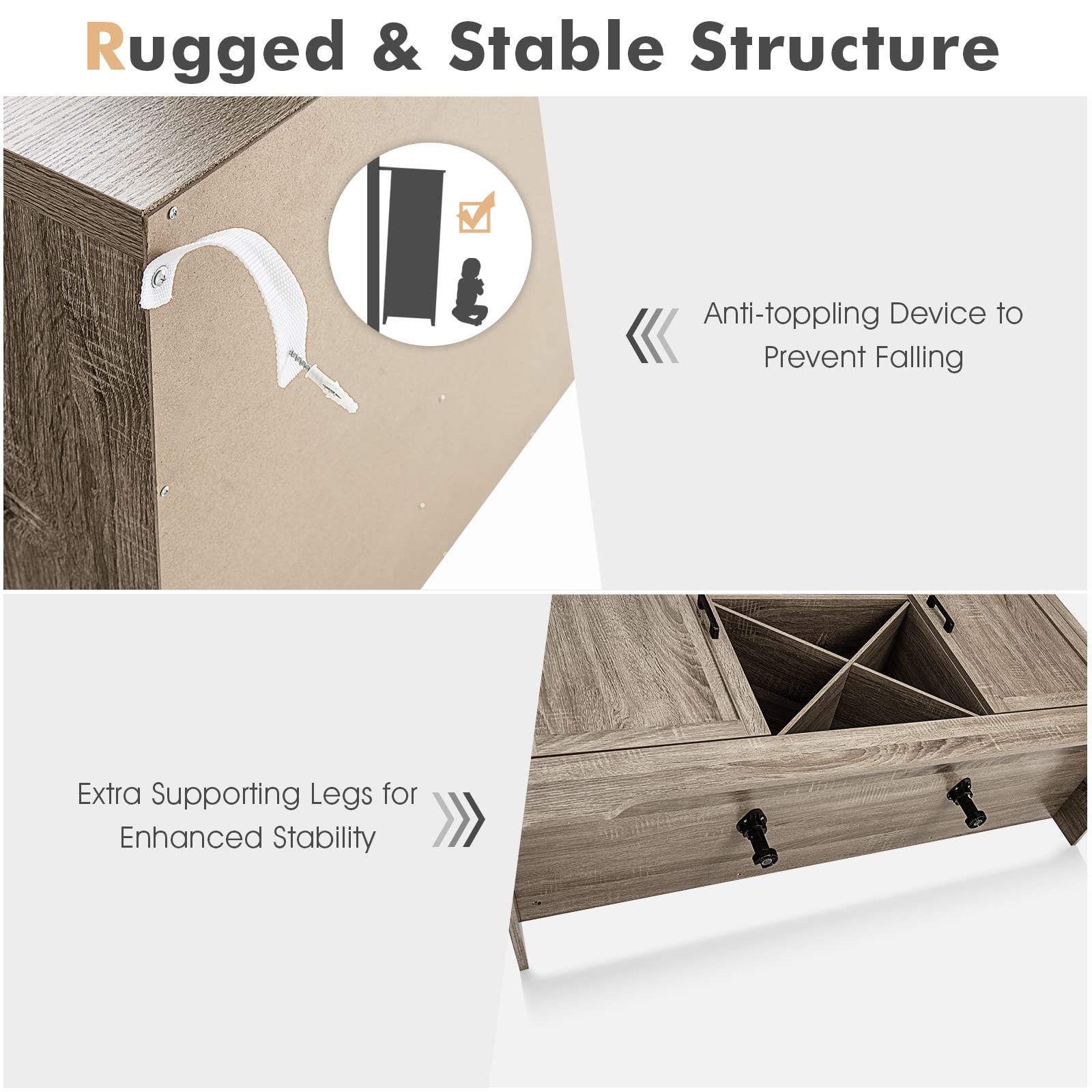 Have you found a favored storage cabinet? Our buffet server sideboard set would be one of the appropriate choice for you. The combination of spacious countertop, open shelf and drawers provides ample storage space for various kinds of kitchen supplies.2 concealed cabinets with adjustable shelf fulfill different storage needs. Moreover, the detachable wine rack is convenient for you to keep bottles well-organized and maintain wine flavor perfectly. The wine cabinet is a practical and great addition for your dining room and kitchen that features superior durability and elegant appearance.