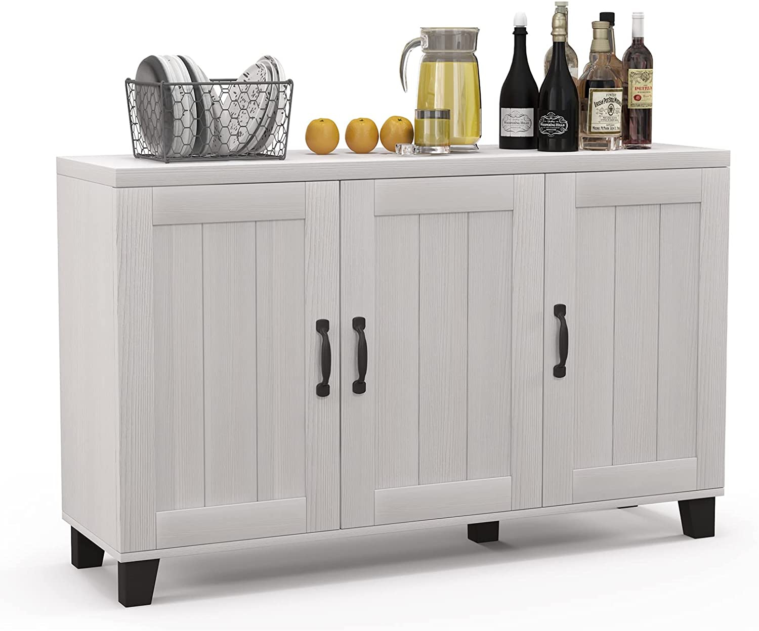 The kitchen cupboard has a wide countertop and 2 cabinets of different sizes, so your cooking supplies can be neatly organized. Each shelf can be freely installed to ensure flexibility of space arrangement, and an adjustable distance of each gear is 1.2" For better stability, the cupboard cabinet has 2 anti-tipping kits to firmly fix itself to the wall. Moreover, it also comes with 2 cable management holes to avoid messy wires. Since the whole sideboard is 3" off the ground, it's easy for daily sweeping and helpful to be isolated from a wet floor for hygiene. According to your needs, place it in the dining room, living room, bedroom, etc.