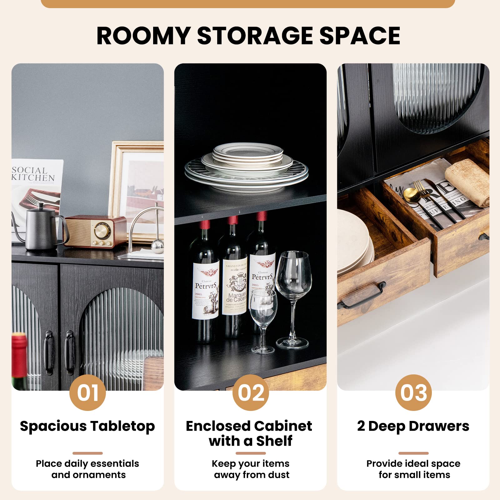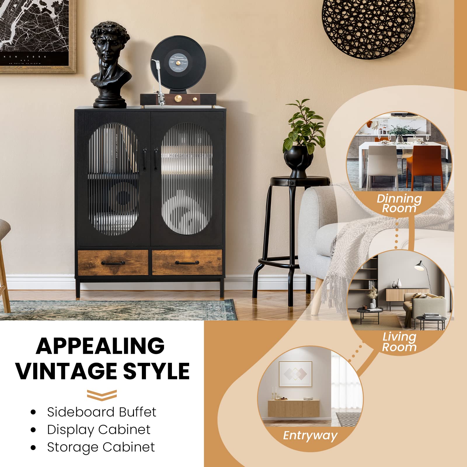 It has a 2-tier storage cabinet and 2 deep drawers that can sort and hide a variety of sundries. Besides, the spacious countertop is ideal for displaying your favorite ornaments, photo frames and vases. Thus, the cabinet can be used as a buffet sideboard, display cabinet, storage cabinet according to your different needs. The industrial appearance and corrugated tempered glass doors make it stylish and eye-catching.