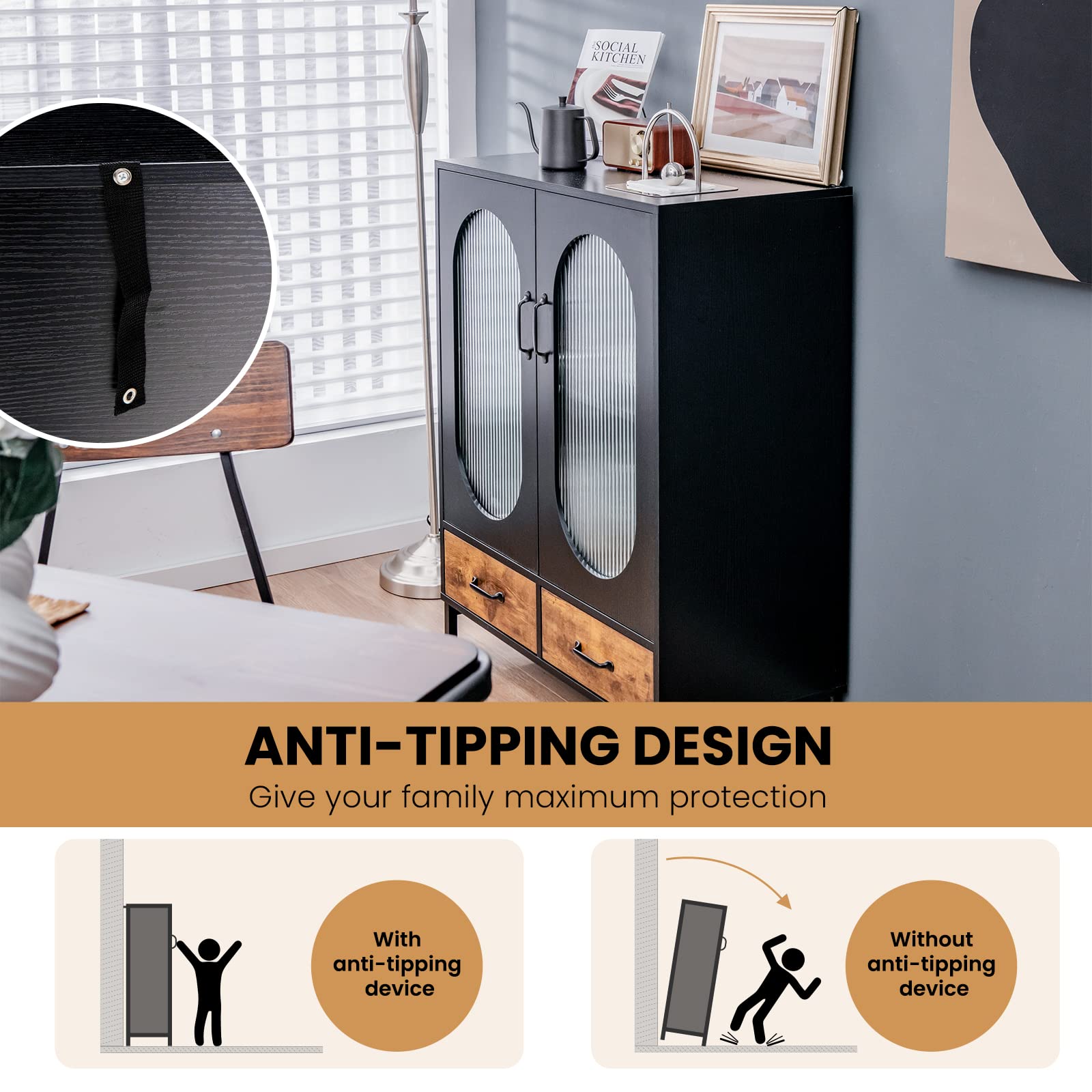 High-quality Material & Stable Structure: Supported by durable anti-rust steel frame, the coffee bar cabinet boasts excellent durability and strong load-bearing capacity. More importantly, there is an anti-toppling device at the back of the cabinet, which greatly improves stability and safety.