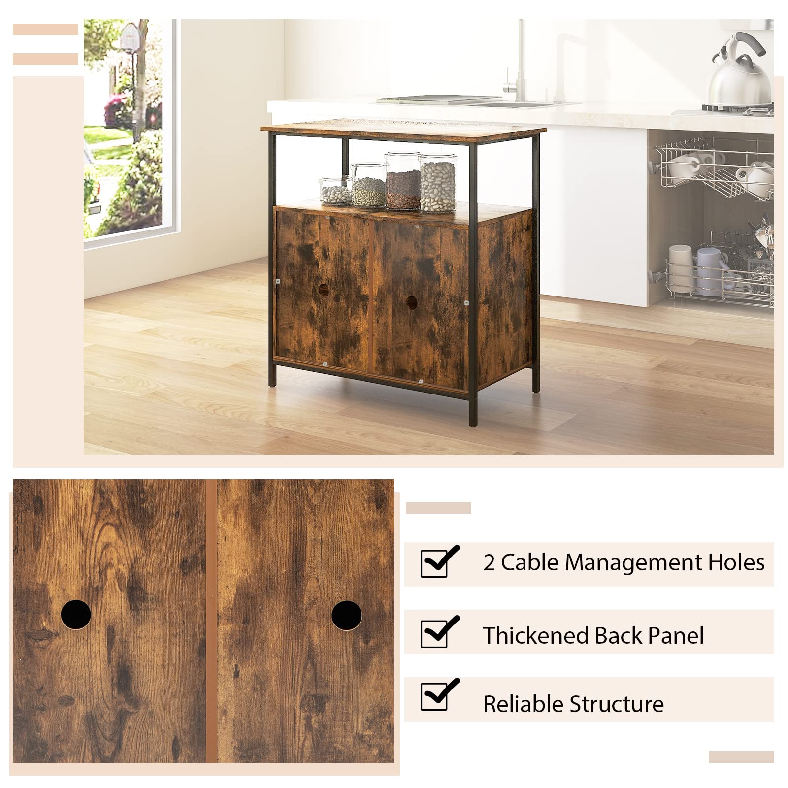 Superior Materials for Strong Structure: Premium materials ensure superior quality. Our kitchen sideboard is made of heavy-duty metal frame, which ensures a highly reliable structure. And the table top is sturdy enough to hold a weight capacity up to 110 lbs.