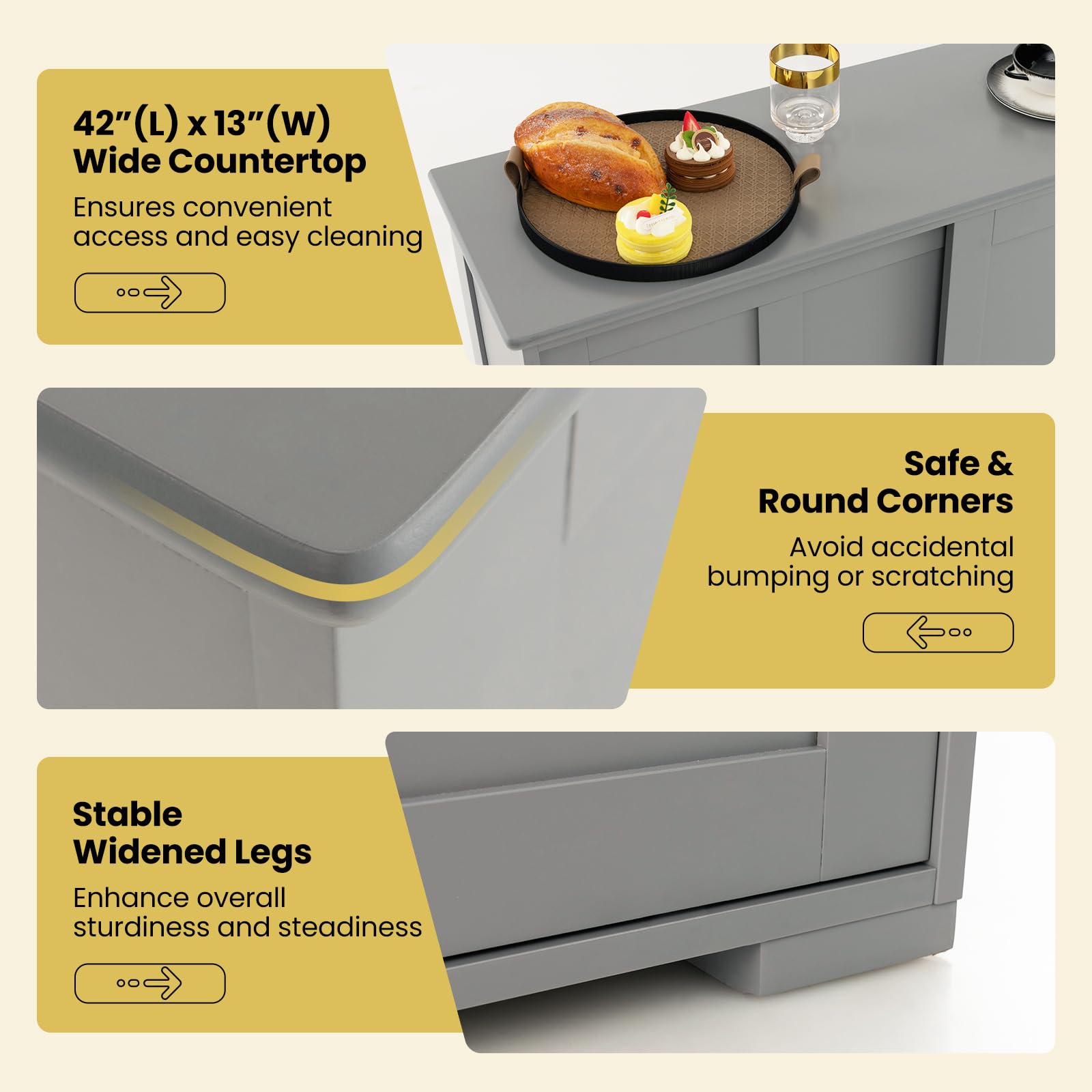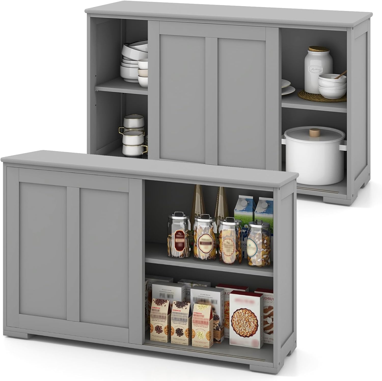 Are you tired of clutter and disorganization in your kitchen or dining room? Just try our buffet sideboard and say goodbye to struggling to keep things organized. Our storage cabinet features a wide countertop and 2 compartments for you to store plenty of items. Besides, with a 3-level adjustable shelf behind the door, you are allowed to manage the interior storage space as you like. Plus, if needed, you can also remove the active shelf for higher storage space. 2 sliding doors enable you to conveniently find what you need from the stored items. Furthermore, the widened support legs and anti-tip system keep the cupboard stay secure and steady.