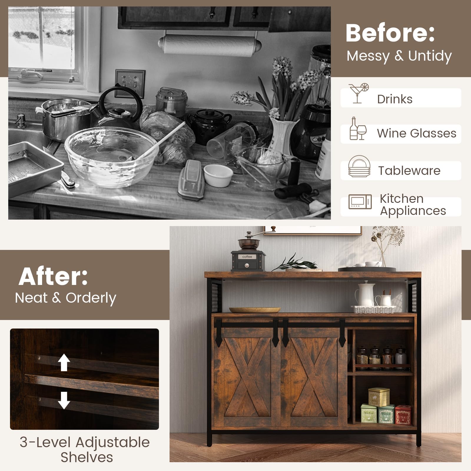 Our buffet cabinet will be a perfect decoration for varied rooms. Unique wood grains and chic appearance add a touch of texture and charm to your living room, kitchen, dining room, etc. Additionally, it offers multiple storage options to help you keep different kinds of items in organized. 3-level adjustable shelves allow you to customize interior storage space for sundries of different heights. Messy and untidy environment before will become neat and orderly thanks to the flexible storage space. Moreover, 2 sliding barn doors hide your items and save limited space. To ensure its sturdiness as well as stability, we design it with adjustable foot pads and anti-toppling devices.