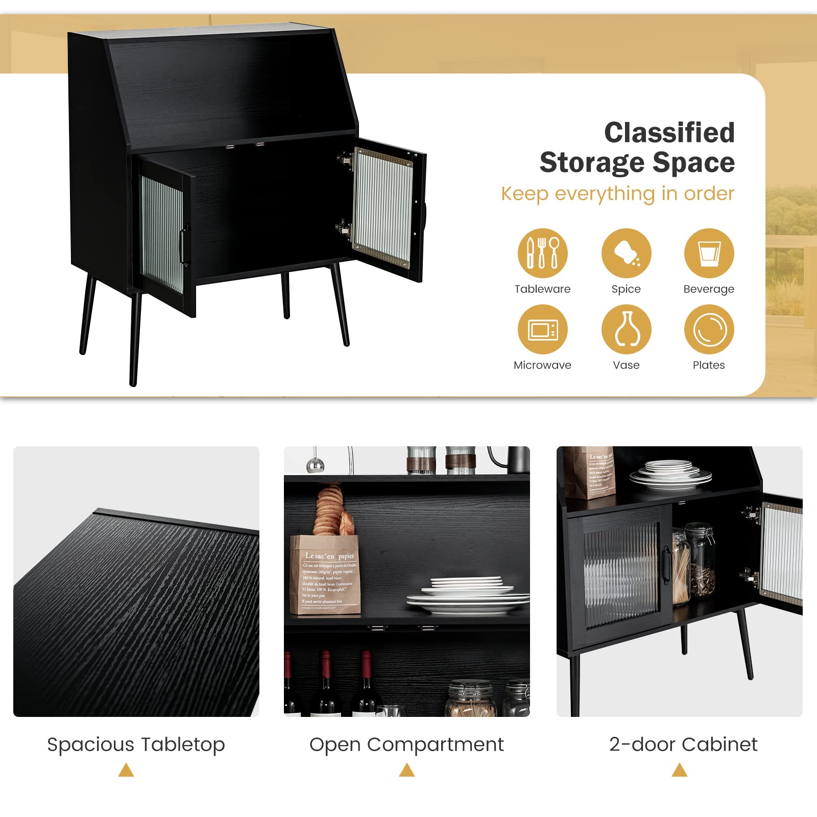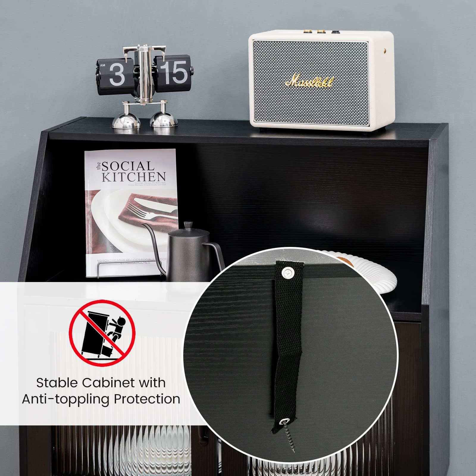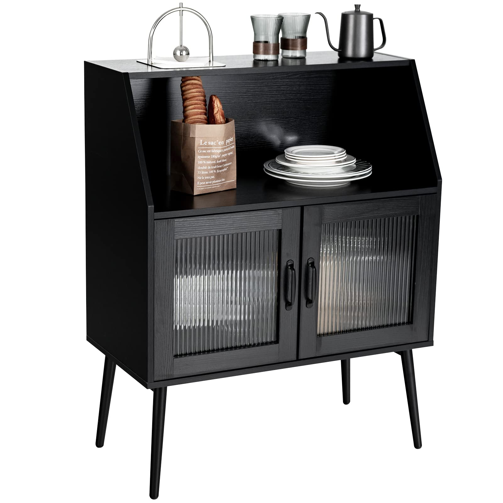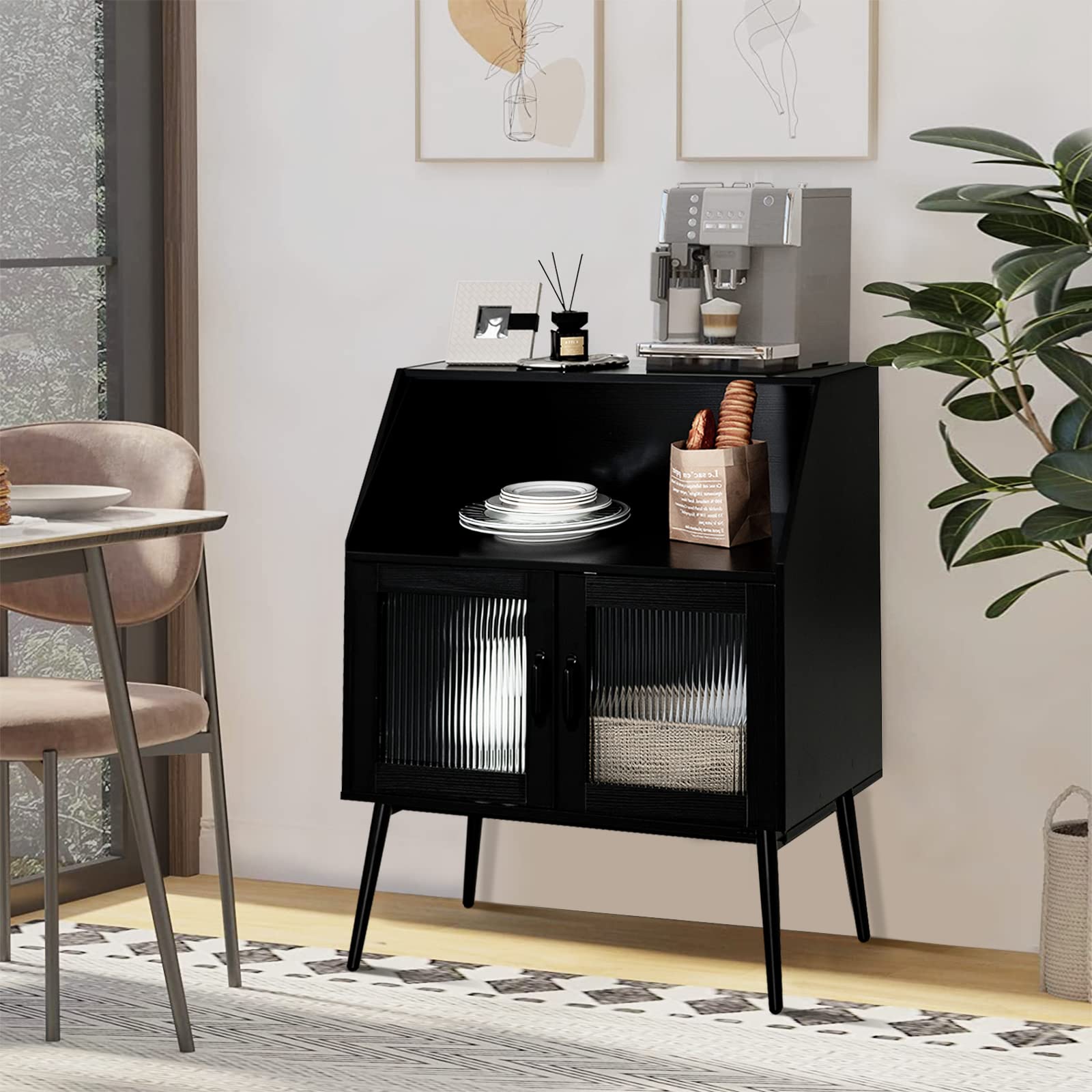 This mid-century modern buffet cabinet combines styles and functions, working well as a space organizer in the kitchen, dining room, living room, etc. With the large storage capacity, including a spacious tabletop, a large open compartment and a 2-door cabinet, the kitchen sideboard can keep household essentials, ornaments and other sundries well organized. And the corrugated tempered glass doors effectively keep the clutter out of sight. What's more, the side cabinet is a durable and sturdy unit that will accompany you for a long time. With the robust steel legs and anti-toppling device, the bar cabinet can stay upright on the floor without wobbling or tipping over. Besides, there are thoughtful details for a better experience, such as the alloy knobs, magnetic door catches and non-scratch pads.