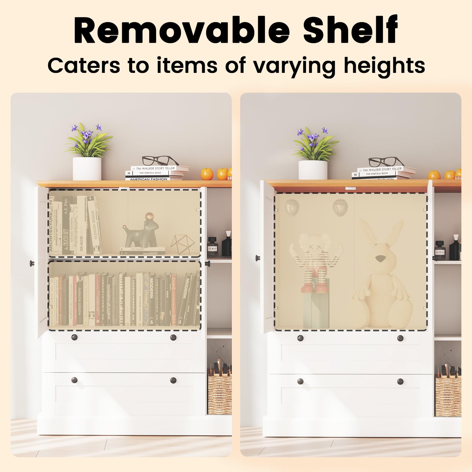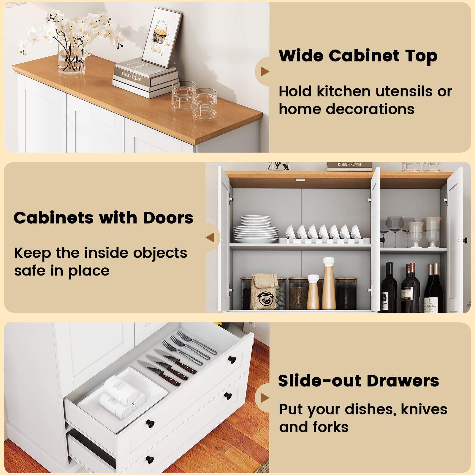 This kitchen storage cabinet includes 3 doors and 2 drawers, inside which there is plenty of storage space for your belongings. Featuring a detachable shelf, the coffee bar cabinet provides flexibility for objects of various heights. The convenient round knobs make it a breeze to open and close drawers and doors, while the robust pedestal base contributes to the overall stability. Whether placed in the kitchen, dining room, or living room, this farmhouse storage cabinet is a great addition that infuses a charming touch to your space.