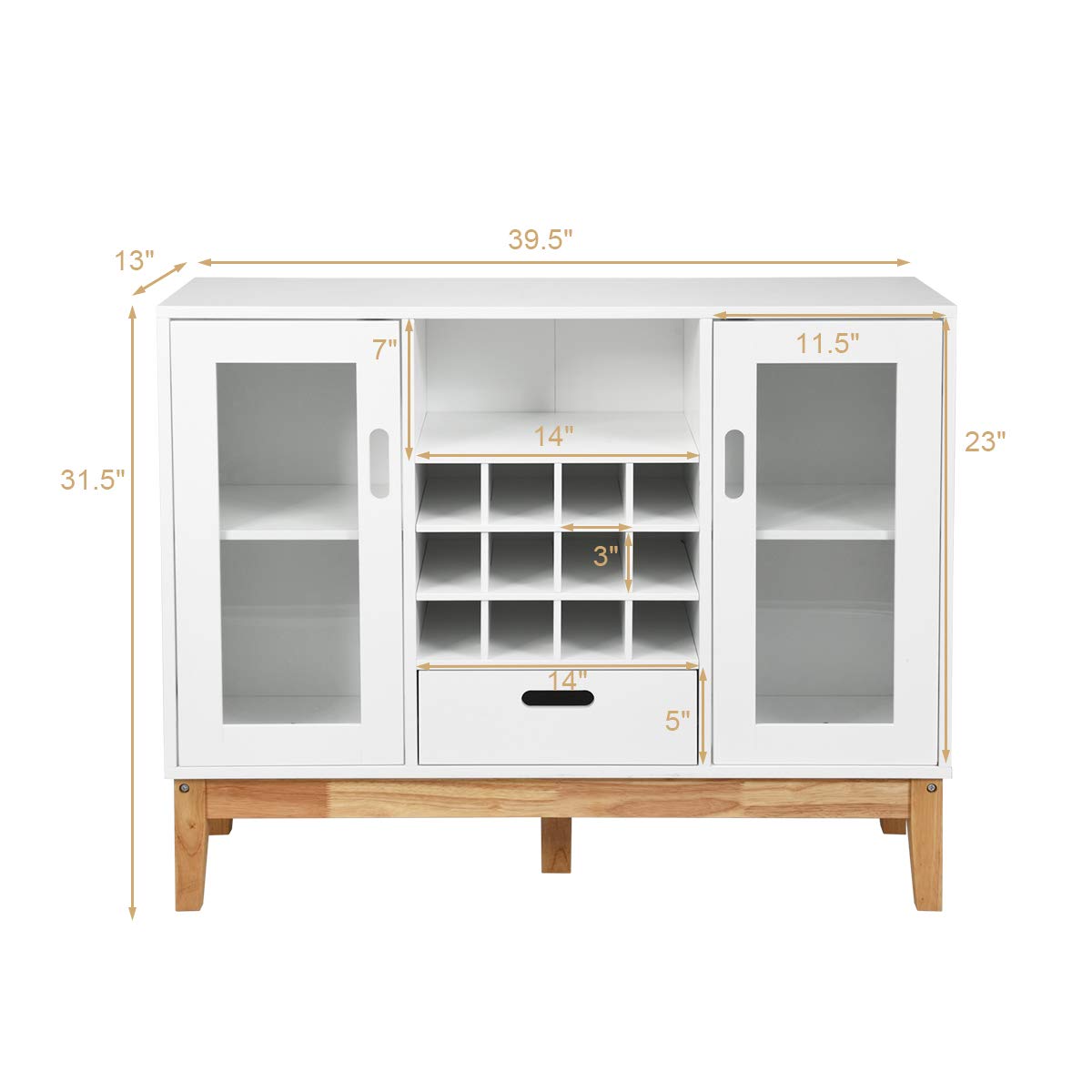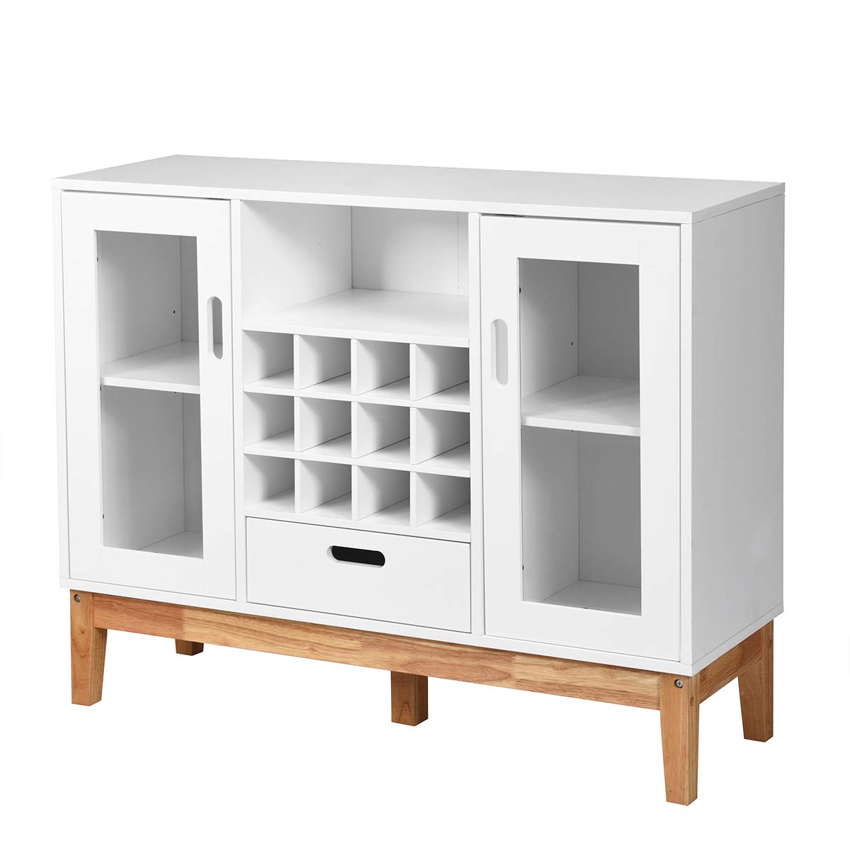 The well-organized wooden wine rack console sideboard is stylish and versatile to offer you much additional storage space in the kitchen or dining room. With large table top, open shelf, 2 cabinets with transparent door on the each side, 12 bottle wine racks and bottom drawer that provided with ample storage space, you can place your items in order. The high quality MDF and rubber wood combined with 5 legs construction creating a buffet cabinet table with great stability and sturdiness for long term use. Moreover, simple lines and elegant style also make it a great decoration in your living room, bedroom or somewhere else. Enjoy your happy and relax time with this entertainment center!