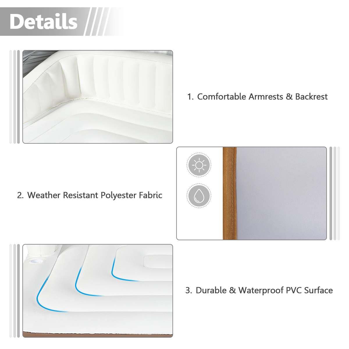 - Separate Inflation & Comfortable Seat: Our floating lounge has 3 air values, 2 at the bottom and 1 at the back. Comes with the separate air chambers, our canopy island can be inflated to the desired firmness and will stay inflated for days. The raised backrest and armrest is designed to provide you with extra support and protection.